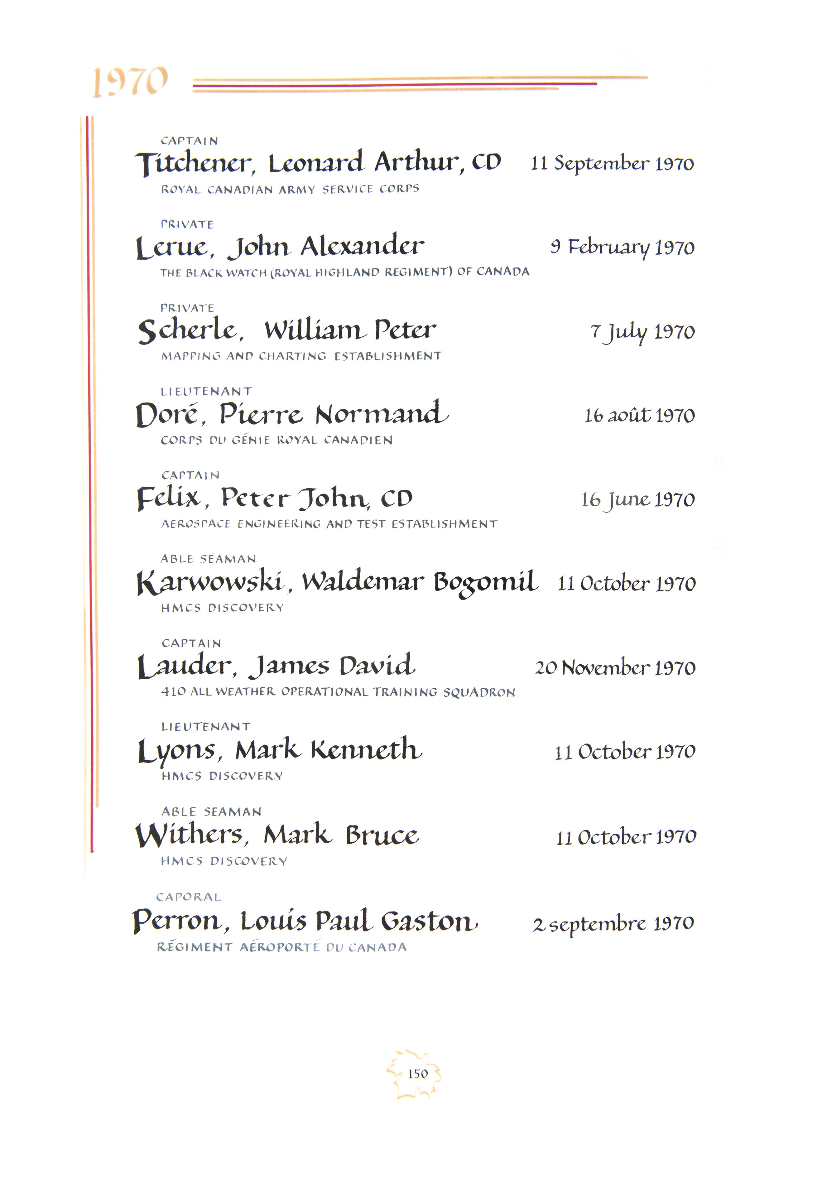 | 80002777 | Titchener | Leonard Arthur | September 11, 1970 | Captain | Royal Canadian Army Service Corps |