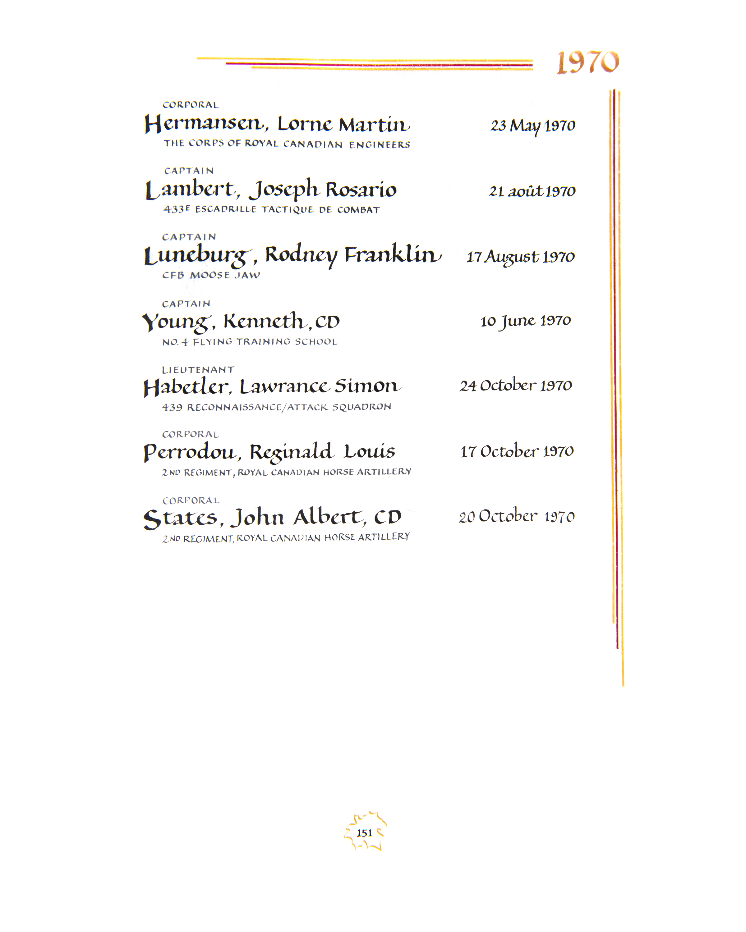 | 80003086 | Luneburg | Rodney Franklin | August 17, 1970 | Captain | CFB Moose Jaw |