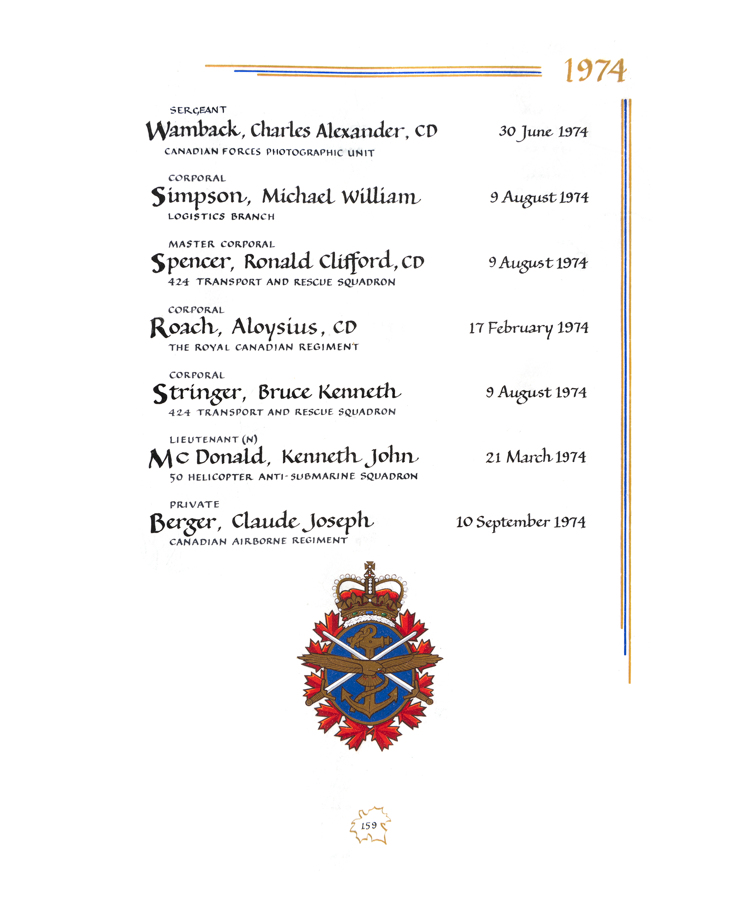 | 80002655 | Wamback | Charles Alexander | June 30, 1974 | Sergeant | Canadian Forces Photographic Unit |