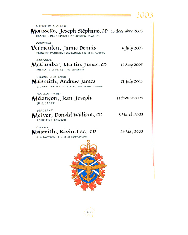 | 80002404 | Naismith | Andrew James | July 21, 2003 | Second Lieutenant | 2 Canadian Forces Flying Training School |