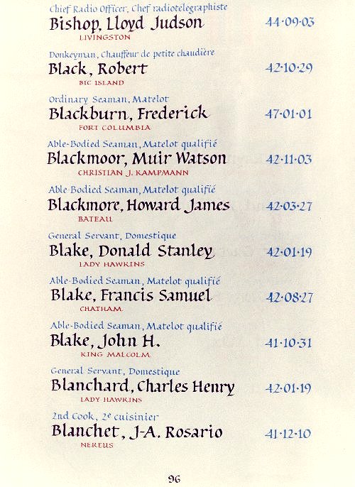 | 2557508 | Blake | Donald Stanley | January 19, 1942 | General Servant | Lady Hawkins |