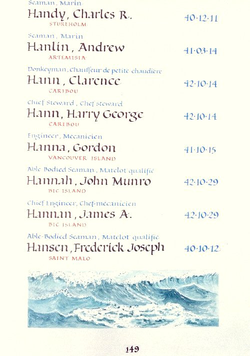 | 2558357 | Hannah | John Munro | October 29, 1942 | Able-Bodied Seaman | Bic Island |