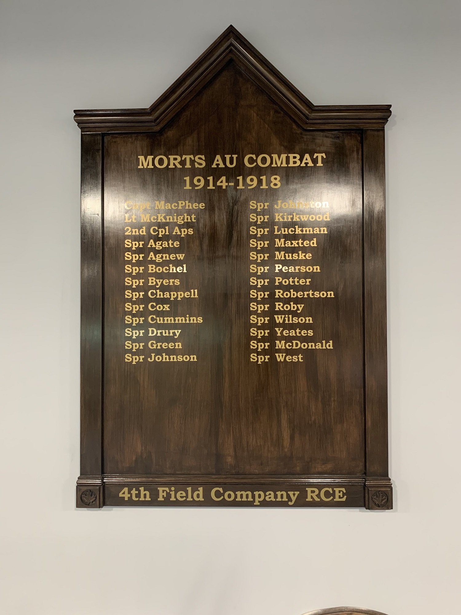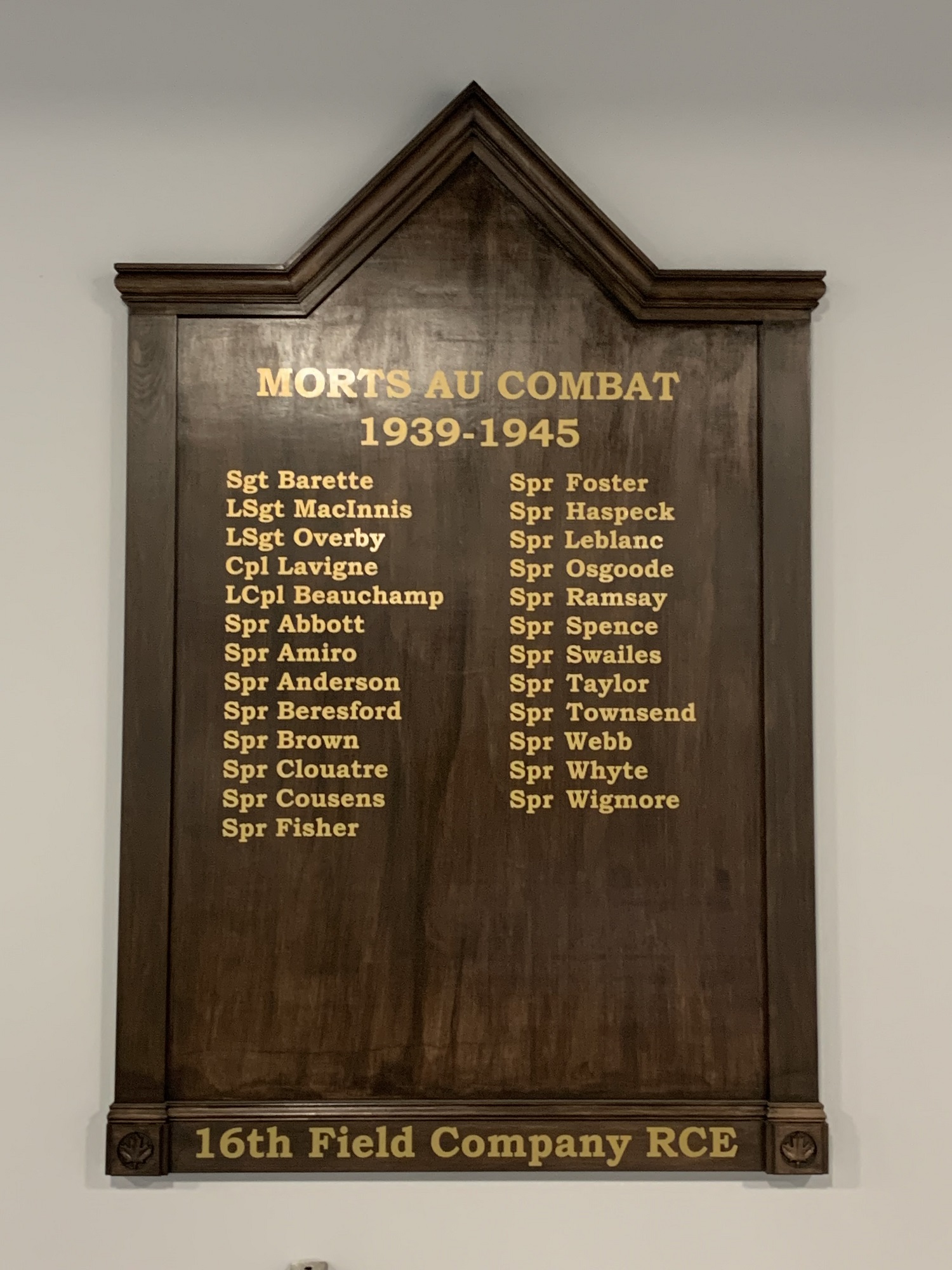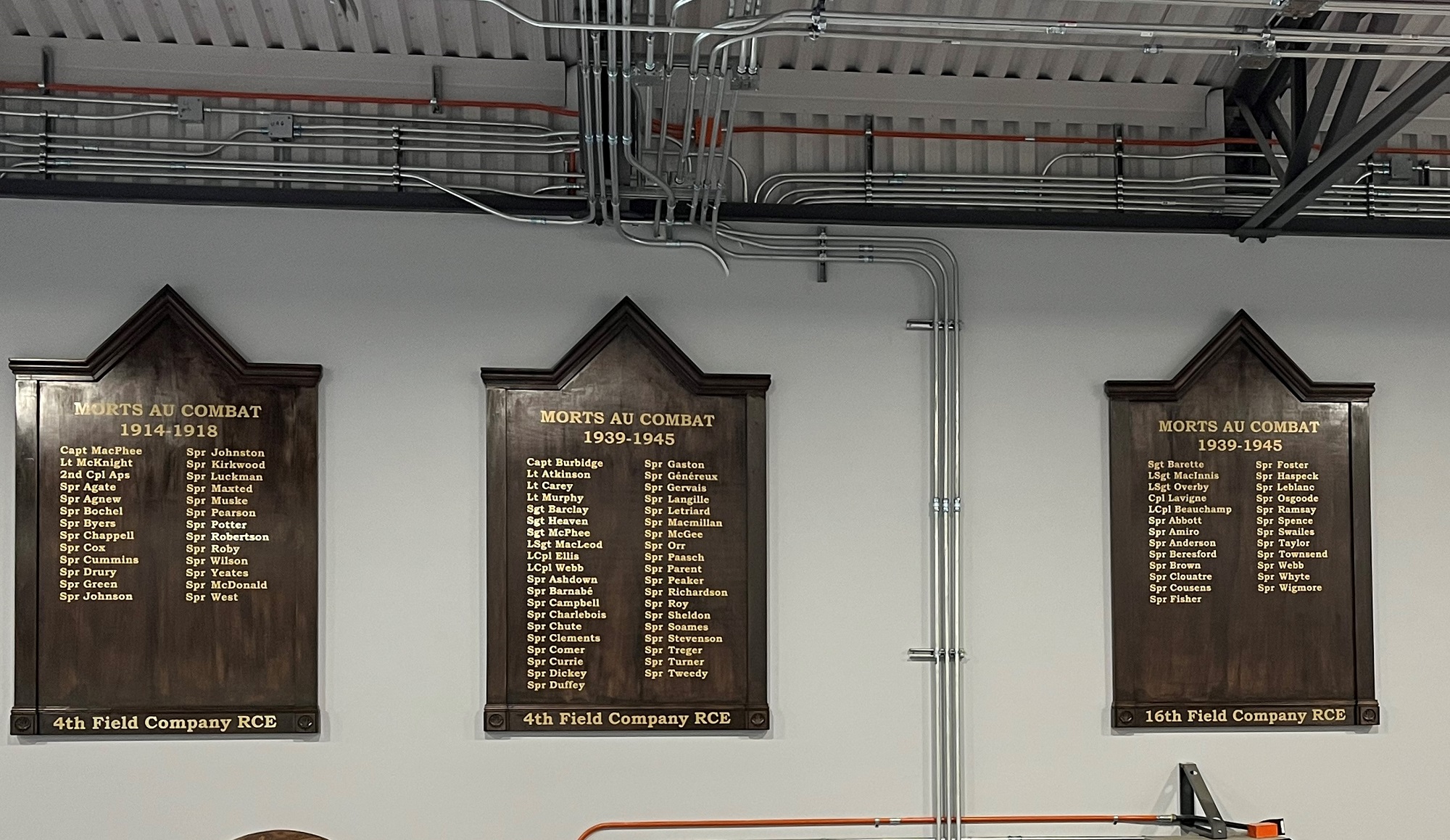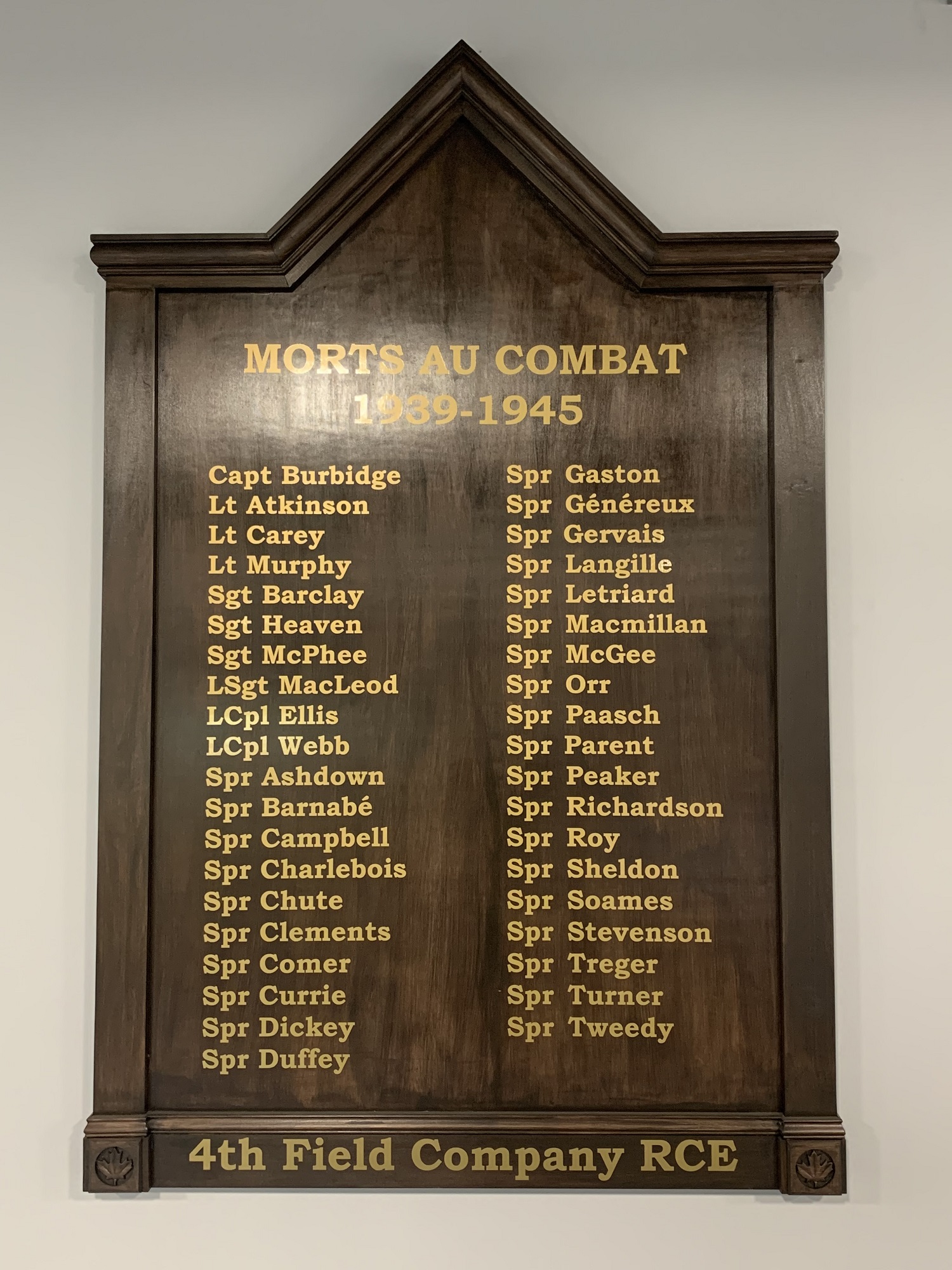 This memorial is dedicated to the members of 34 Combat Engineer Regiment who gave their lives serving in the First World War and Second World Wars. The plaques were manufactured in 2019 by Master Corporal Bégin and the inauguration was in August 2021