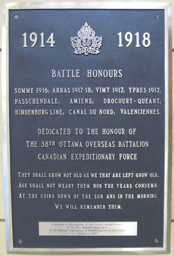 This memorial plaque was presented on the occasion of the Sixtieth Annual Reunion of the 38th Battalion Association by the Cameron Highlanders of Ottawa Regimental Association on October 1, 1978. This memorial is dedicated to the honour of the 38th Ottawa Overseas Battalion Canadian Expeditionary Force.