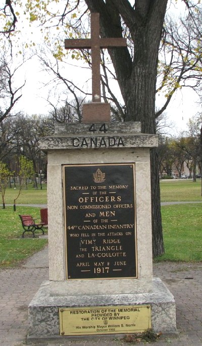 This monument was originally placed on Vimy Ridge in France after the battle in 1917 by the surviving members of the 44th Infantry Battalion, Canadian Expeditionary Force. Removed in 1924 to make room for the Canadian national memorial at Vimy, the monument was brought to Winnipeg and reinstalled in June 1926. It has been restored twice -- in June 1967 and October 1992.