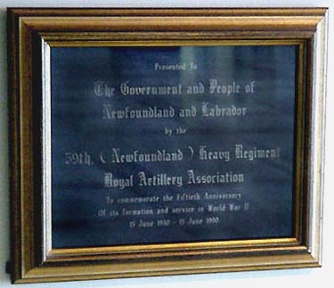 The Memorial, located in the Confederation Building, was erected in memory of those who served in the 59th (Newfoundland) Heavy Regiment in the Second World War.