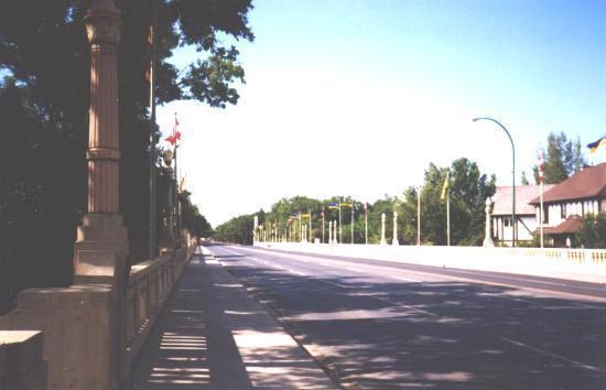 The 850 feet long and 74 feet wide bridge spans Wascana Creek and was designed by James Henry Puntin of Puntin, O'Leary & Coxall. The Art Deco-influenced architectural style elements include the obelisk-like entry towers adorned with portraits of Queen Victoria, lamp posts adorned with images of bison heads, and terra cotta balusters decorated with lotus flowers and papyrus plants. The bridge, is noted for its Egyptian ornamentation, lamp standards and glazed terra-cotta balusters and buffalo heads.