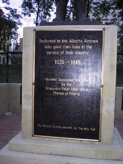 This memorial is dedicated to the more the 1600 Alberta air crew who lost their lives in the Second World War. The monument was based on a model by Calgary artist Andrew Hulbert and sculpted by Don and Shirley Begg. It was unveiled 3 September 2004.