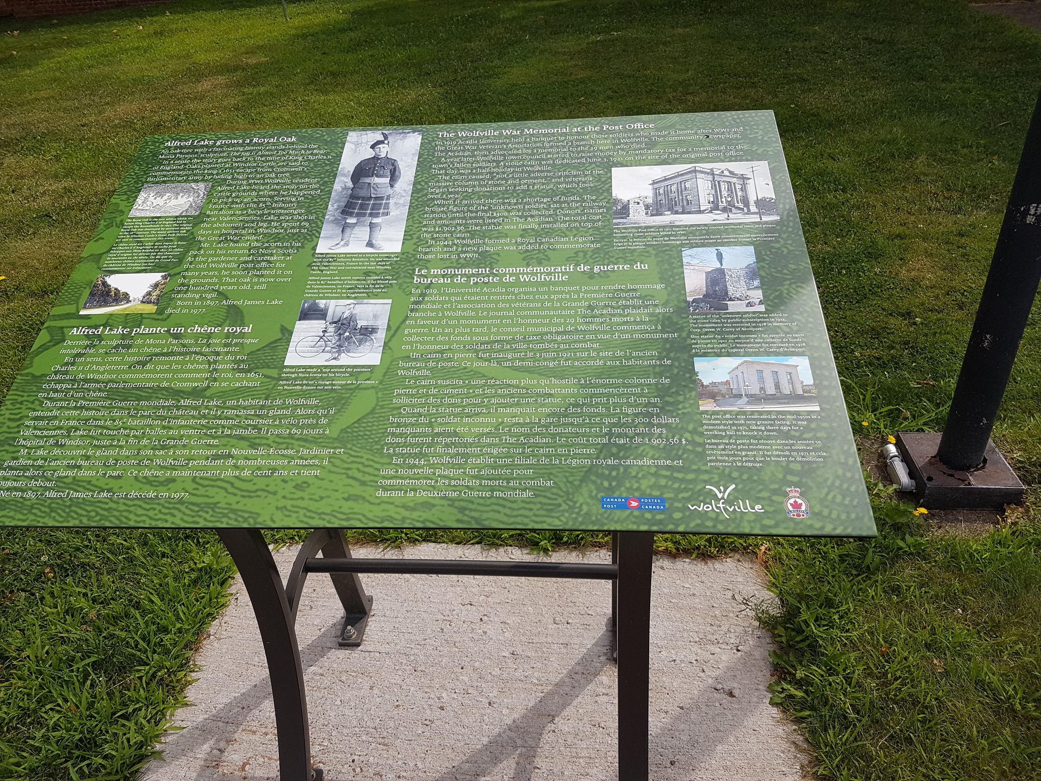 A year later Wolfville town council started to raise money by mandatory tax for a memorial to the town's fallen soldiers. A stone cairn was dedicated June 3, 1921 on the site of the original post office. That day was a half-holiday in Wolfville.