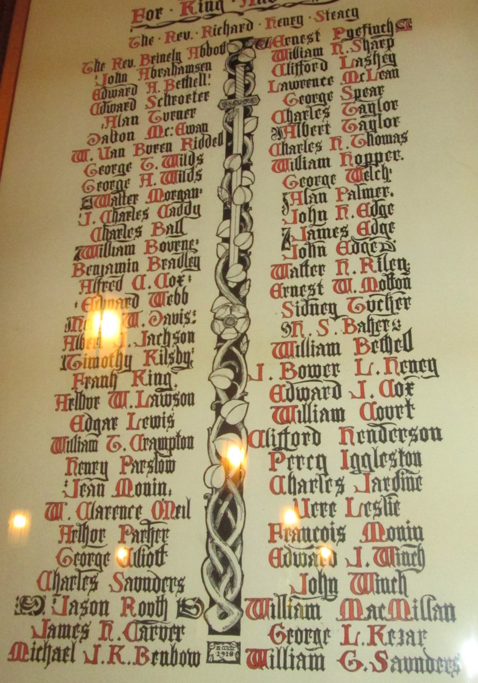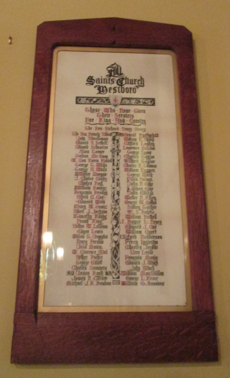 This memorial consists of two framed scrolls, and is dedicated to the members of All Saints' Anglican Church Westboro who served in the First World War. It was unveiled in 1918 by members of All Saints' Anglican Church Westboro.
