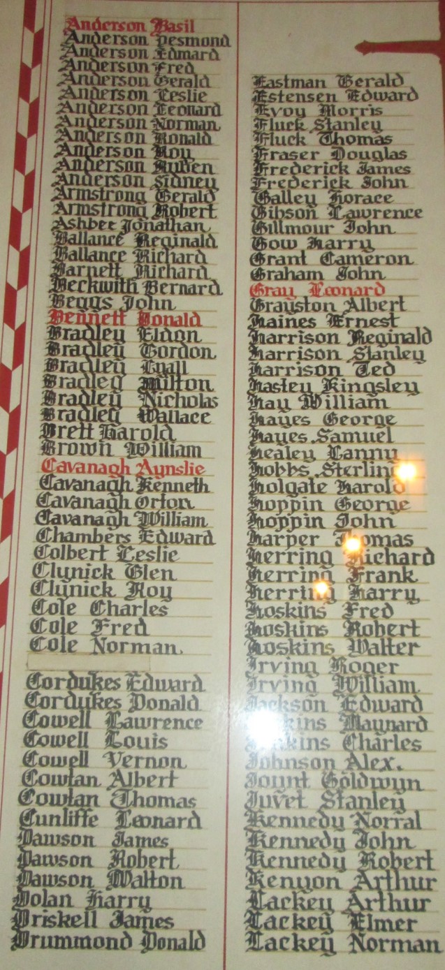 The scroll has names arranged in four columns, and although not specified on the scroll, it appears members who gave their lives have their names written in red.