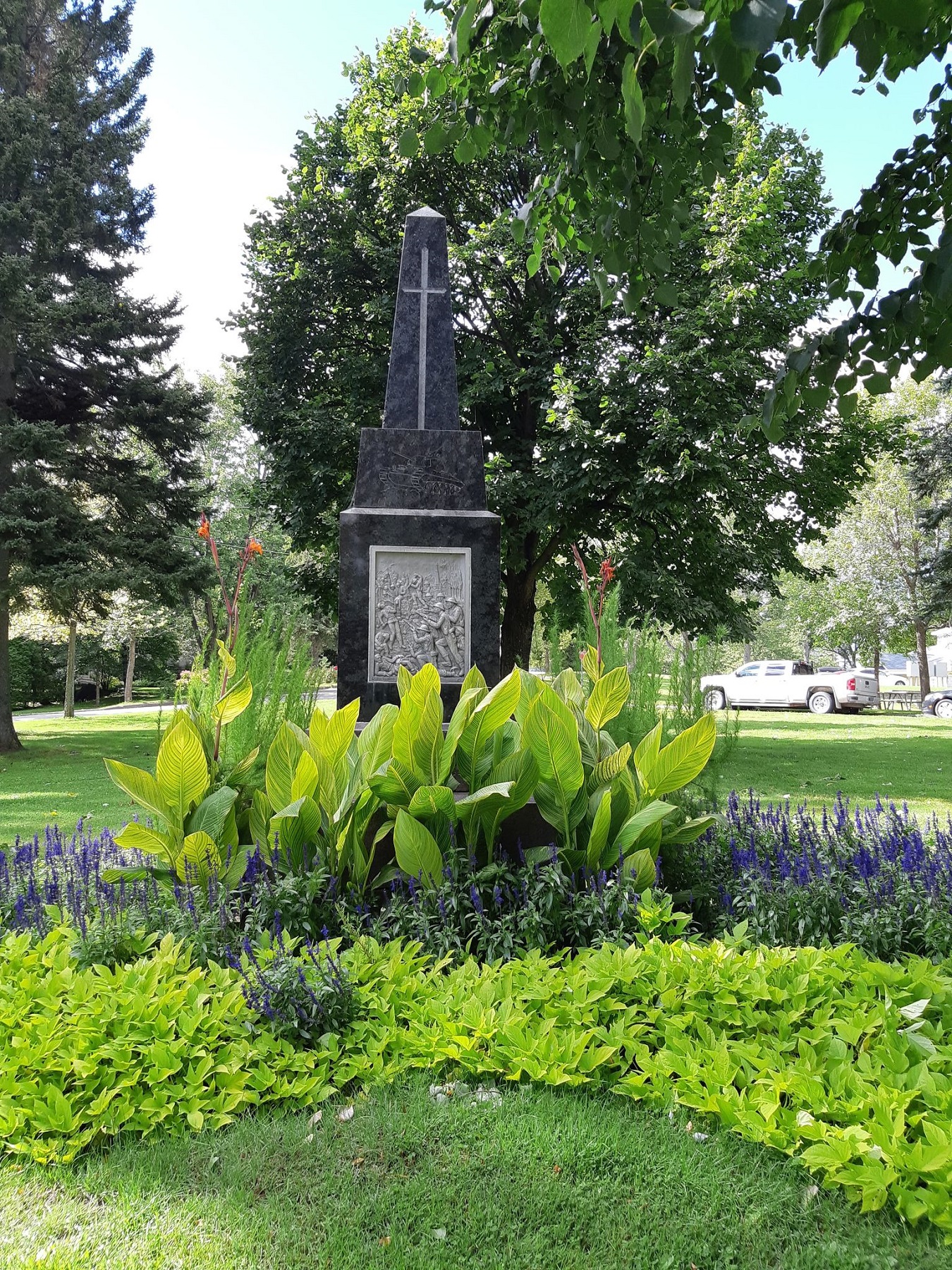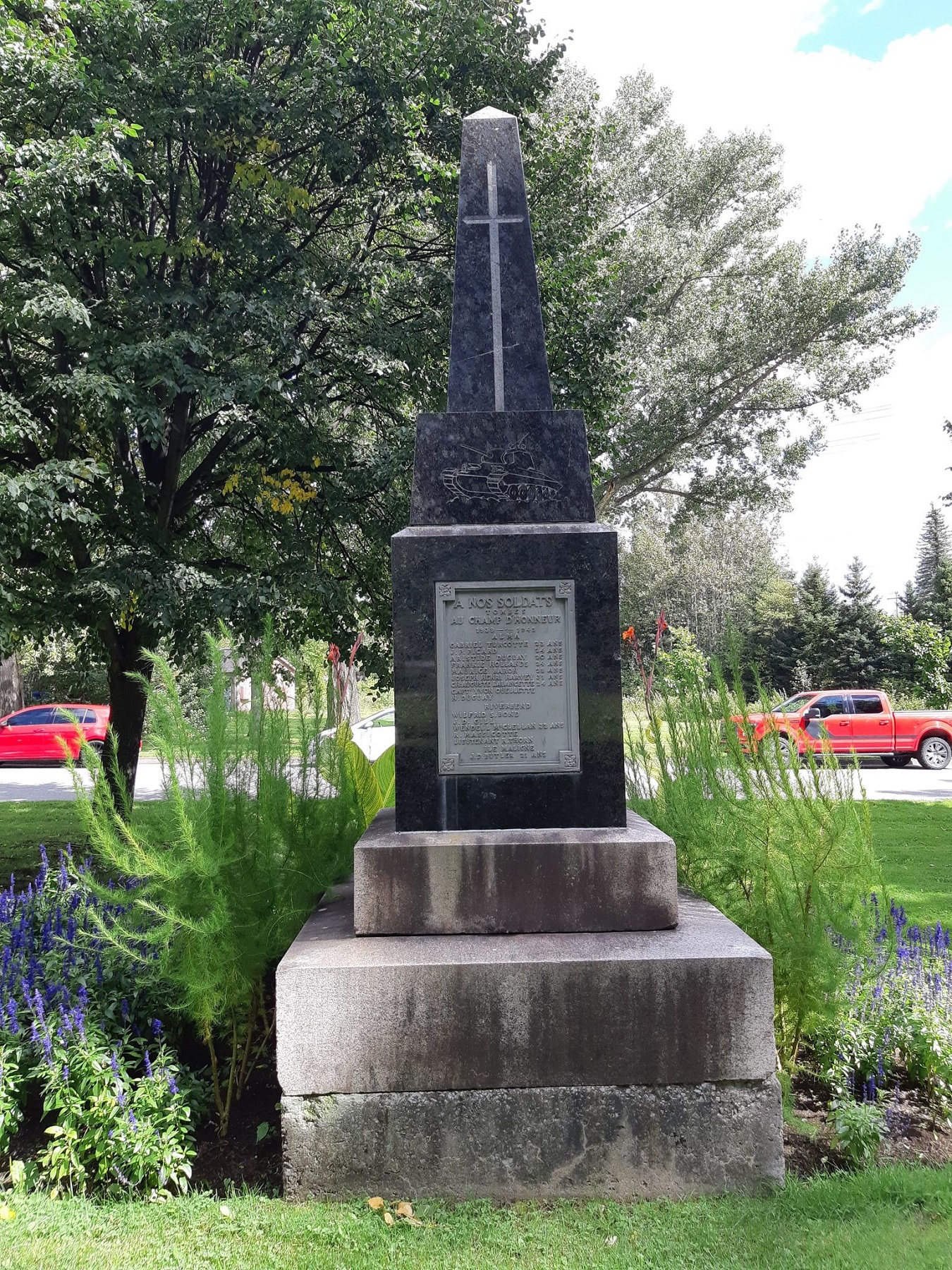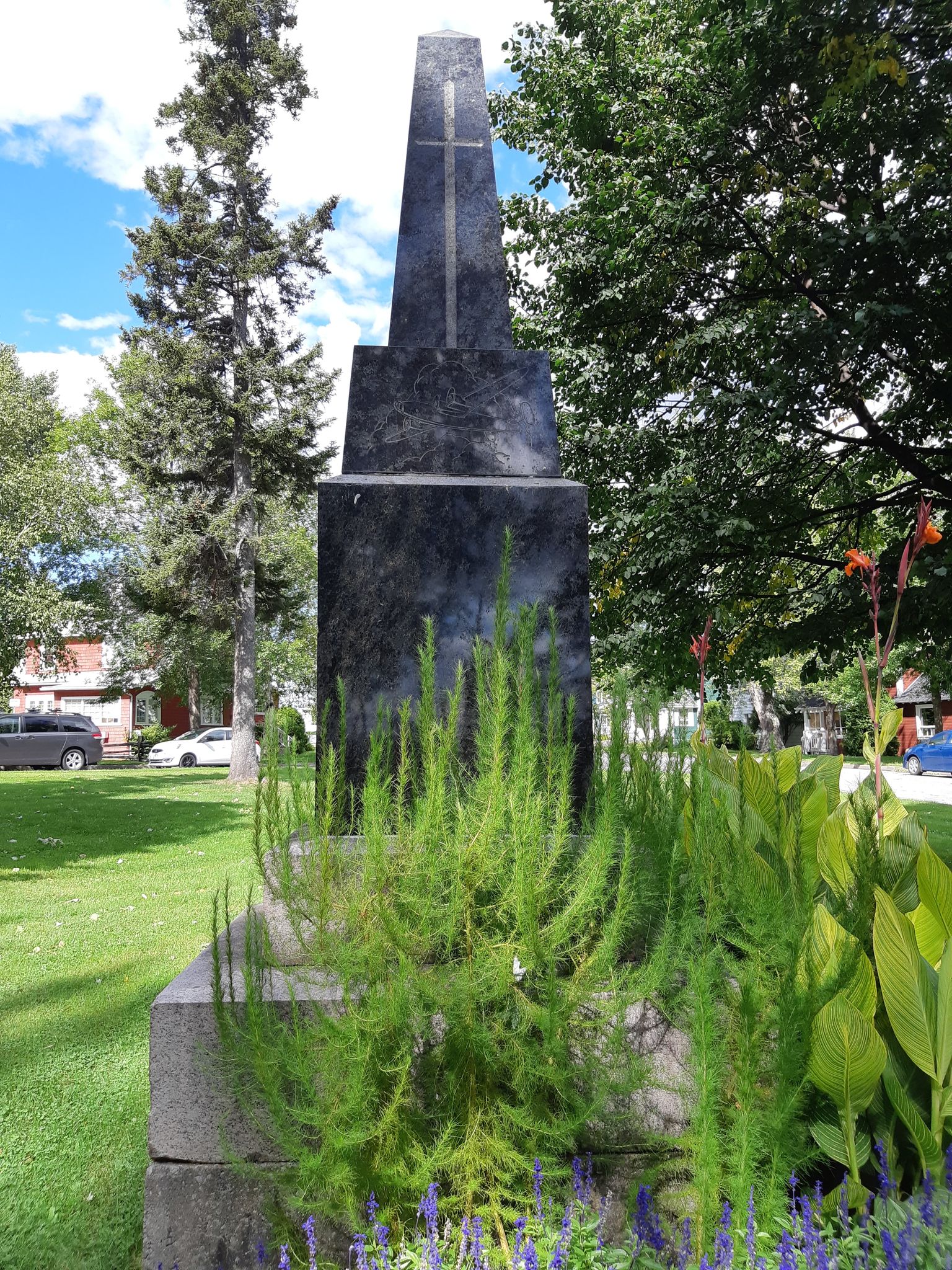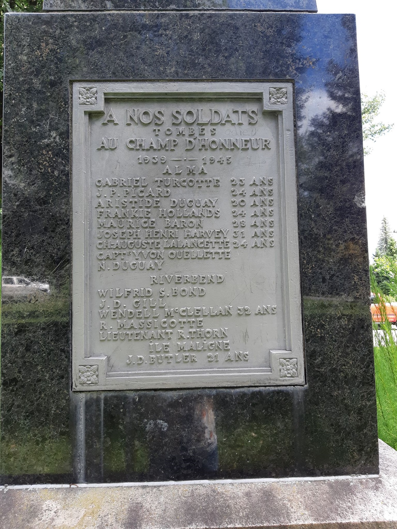 The cenotaph was placed at the corner of Collard Street and Regional Road. In 1962, it was moved near the Town Hall (Alma city center). Then in 1978, a small park was created at the entrance to the Riverbend area and the cenotaph was moved there.