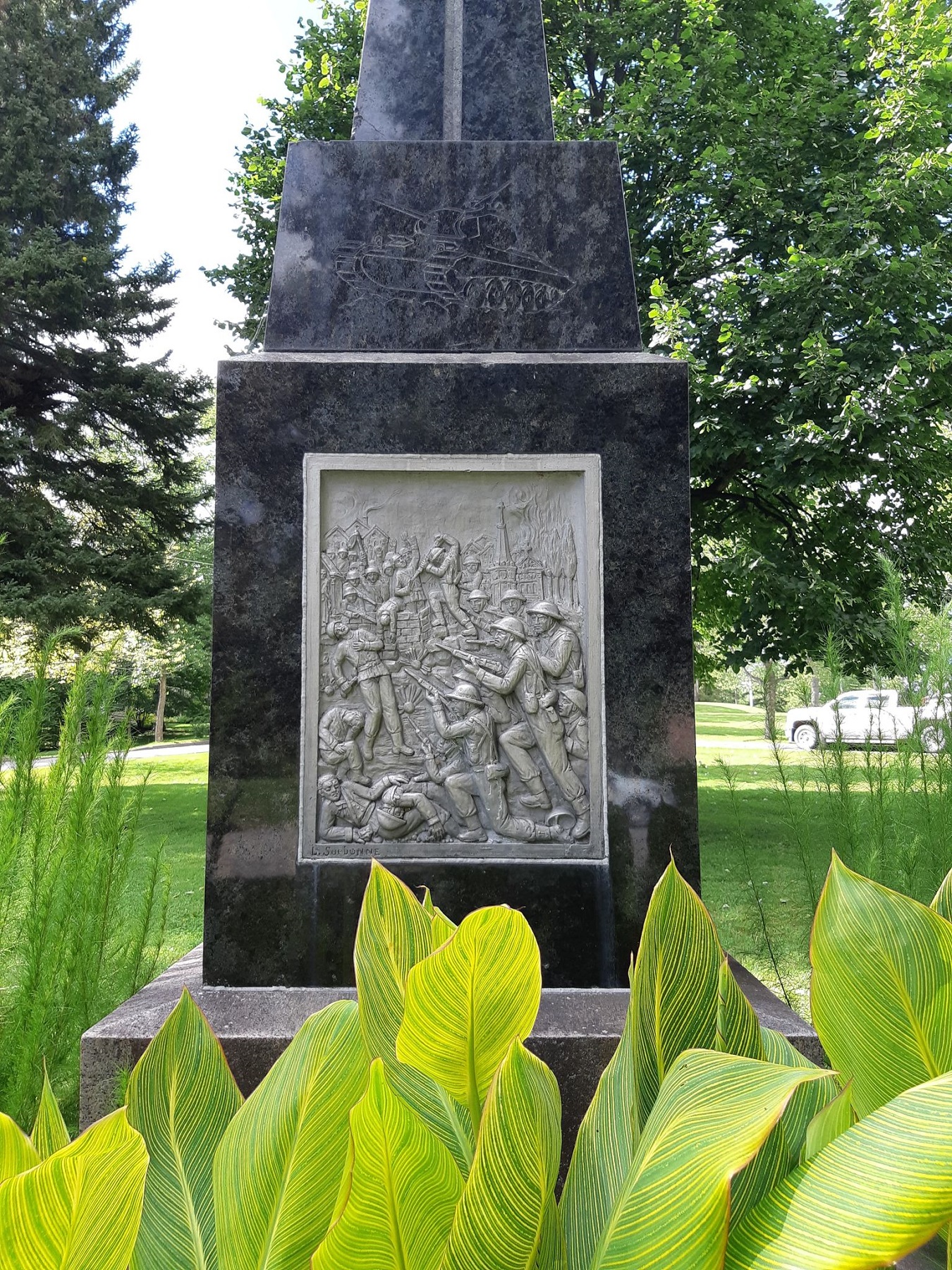 The work of the attacking soldiers was created by sculptor Louis Sorbonne of Quebec. The plate is made of aluminum, significant because several facilities related to the aluminum industry were built in the area to aid in the war effort.