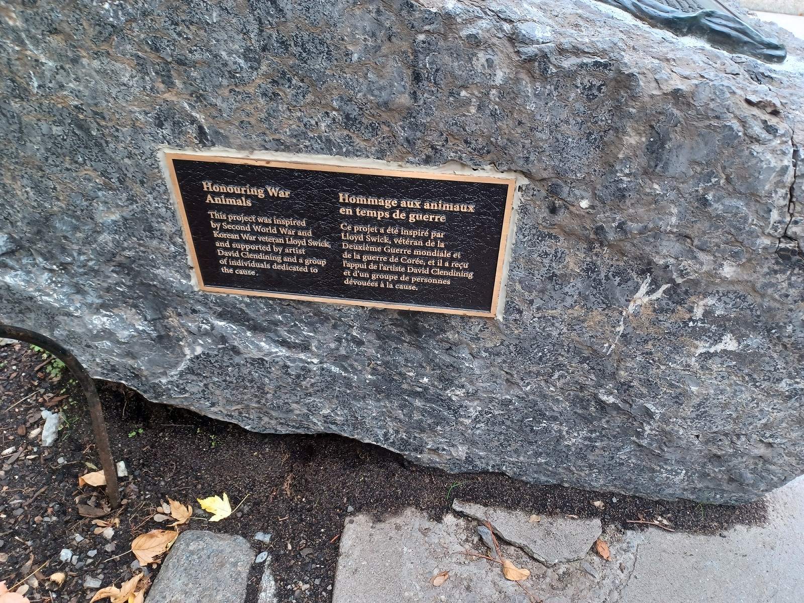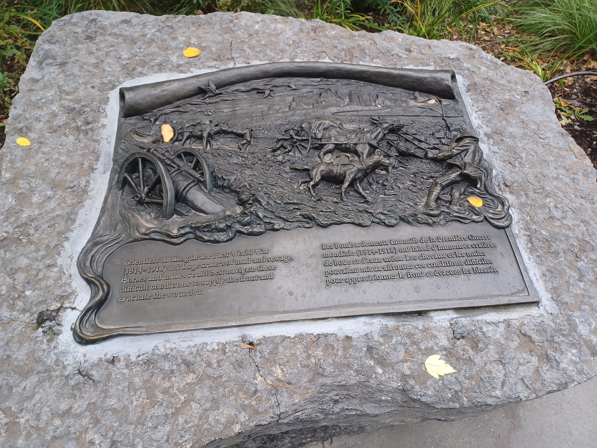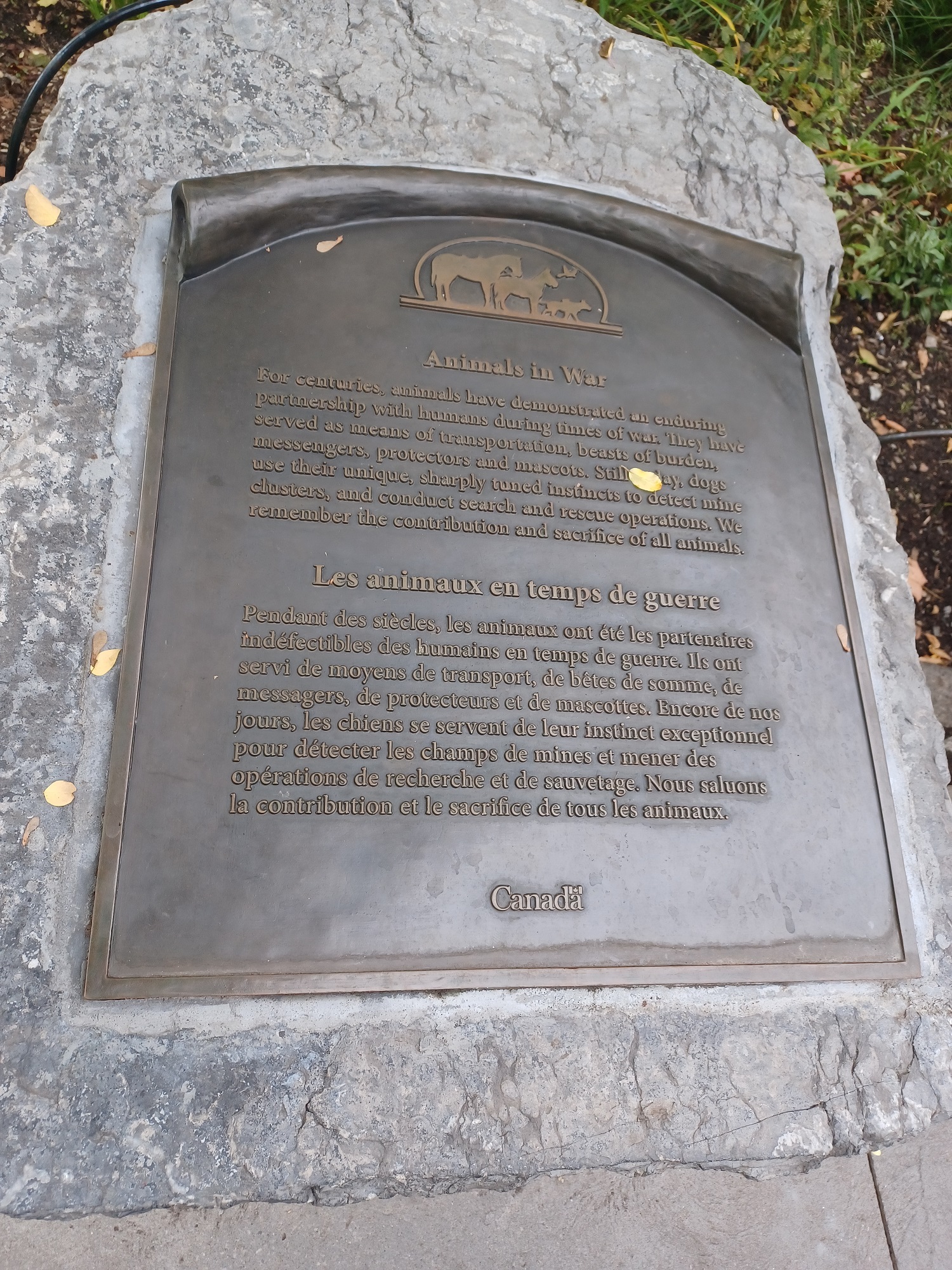 The Animals in War Dedication honours animals that served alongside their human comrades in war. It is symbolically set next to the South African War Memorial, a battle for which Canada supplied 50,000 horses for mounted troops. The footprints of dogs, horses and mules are stamped into the concrete of the Animals in War Dedication, representing the marks they left on the battlefield.