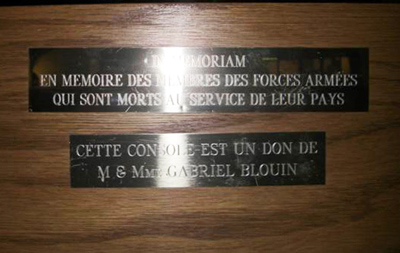 The organ was erected by the parish and Mr. & Mrs. Gabriel Blouin and is dedicated to the members of the Armed Forces who gave their lives in service for their country.