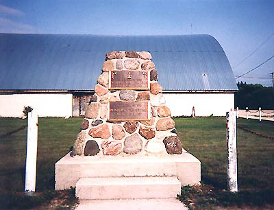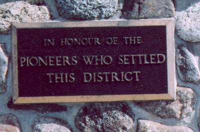 This memorial is dedicated to the local veterans and to the pioneers who settled this area. The cairn was built by a local farmer / stonemason named Willie Sonenholl and the concrete base was formed and poured by volunteer members of Royal Canadian Legion Branch No. 57, the memorial being unveiled in 1984 or 1985.