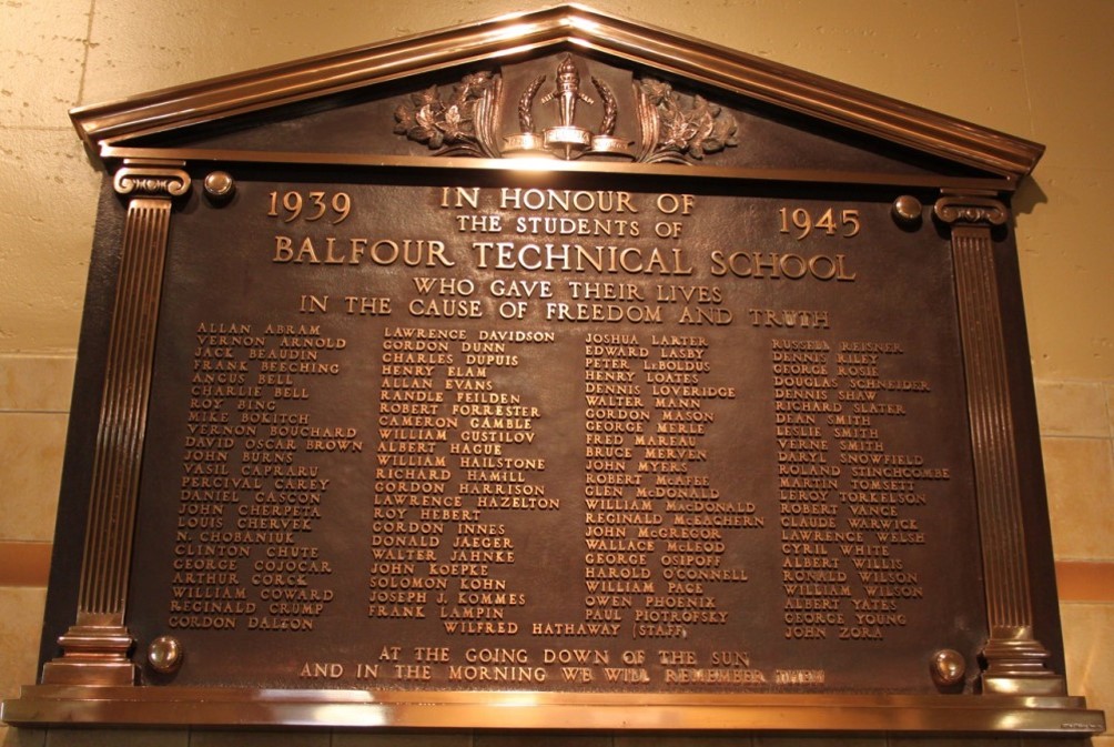 This bronze plaque at Balfour Collegiate is dedicated to the students of Balfour Technical School who gave their lives in the Second World War.