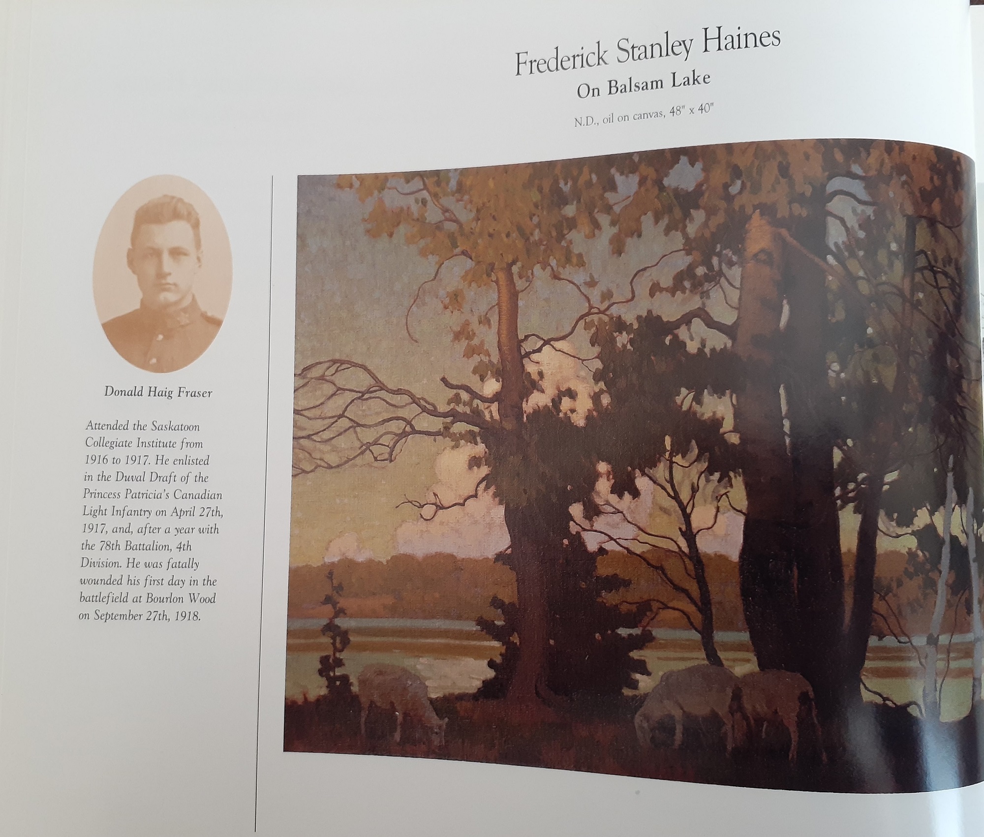 Frederick Stanley Haines' On Balsam Lake was acquired in 1926 and dedicated to Private Donald Haig Fraser. Donald attended Saskatoon Collegiate Institute from 1916 to 1917. He enlisted on 27 April 1917 and was fatally wounded his first day at Bourlon Wood on 27 September 1918.
