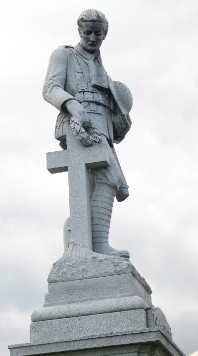 Eleven designs were submitted and the design by McIntosh Co., of Toronto, in conjunction with J.F. Murphy, of Barrie was selected. The cenotaph is 23 feet high, with a nine foot statue on the top. The statue is a soldier in uniform, his helmet removed as he places a floral wreath on a crucifix grave that represents a fallen comrade. The main monument is made of Stanstead, Quebec granite and the statue is of Barrie granite.