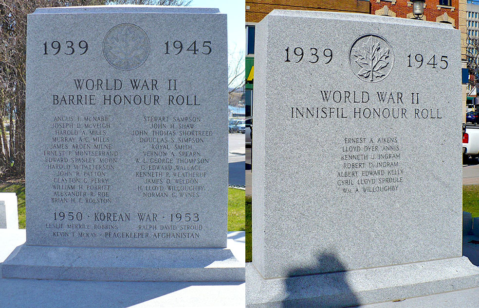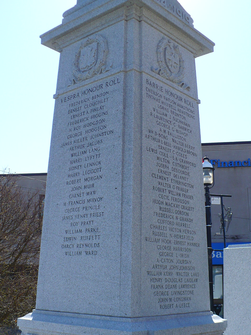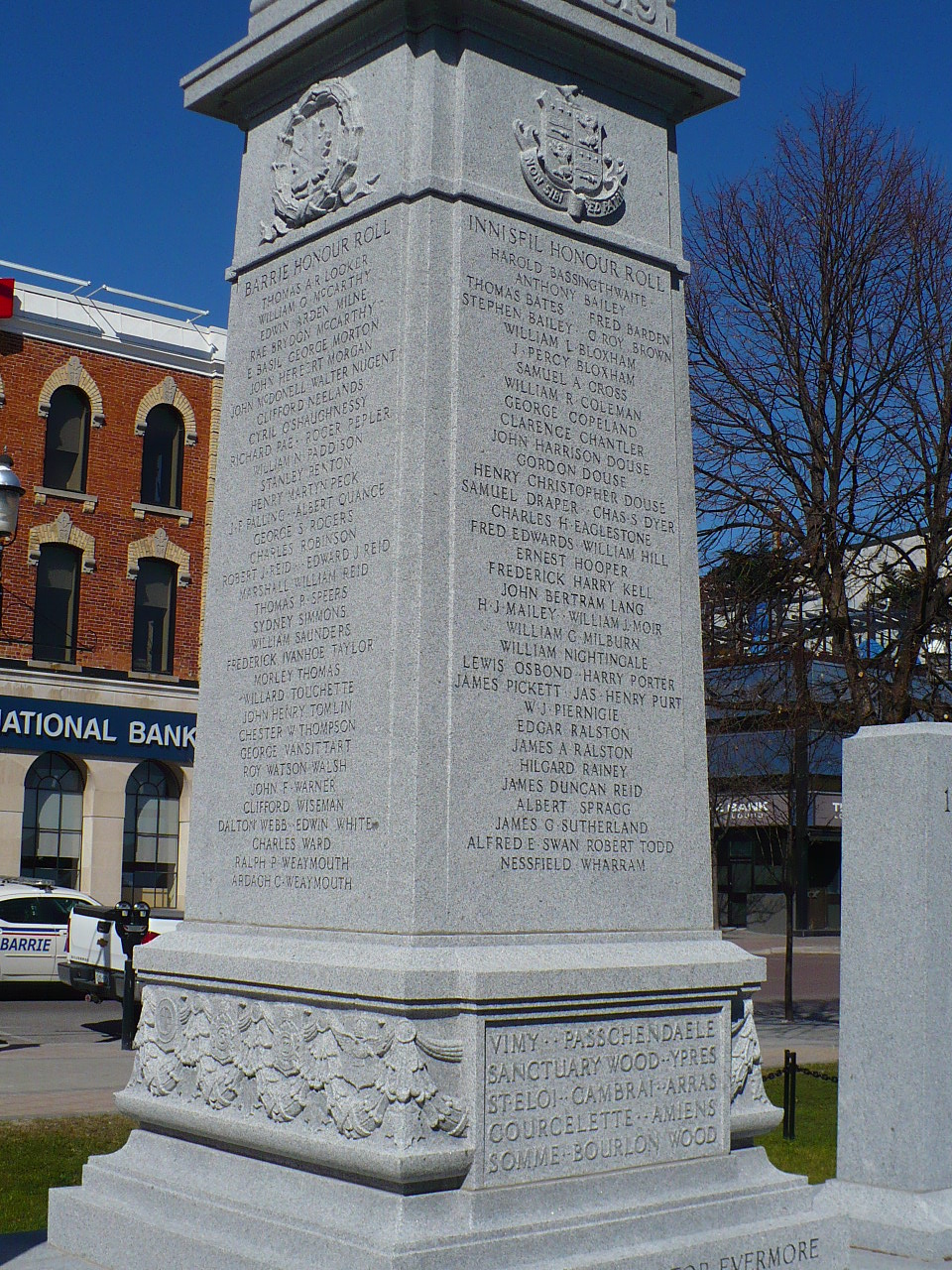The Barrie Cenotaph was constructed in memory of Simcoe County fallen heroes of the First World War and dedicated on June 28, 1922. The cenotaph is unique in that it lists the end of the war as 1919 rather than 1918. While fighting ceased after German surrender in 1918, those responsible for the monument consider the formal end of the war to be the signing of the Treaty of Versailles - June 28, 1919. The cenotaph was dedicated on this same day in 1922.