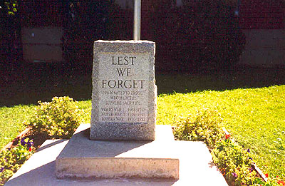 This memorial is dedicated to those who died in the First and Second World Wars and Korean War. It was erected by the Royal Canadian Legion Branch 593.
