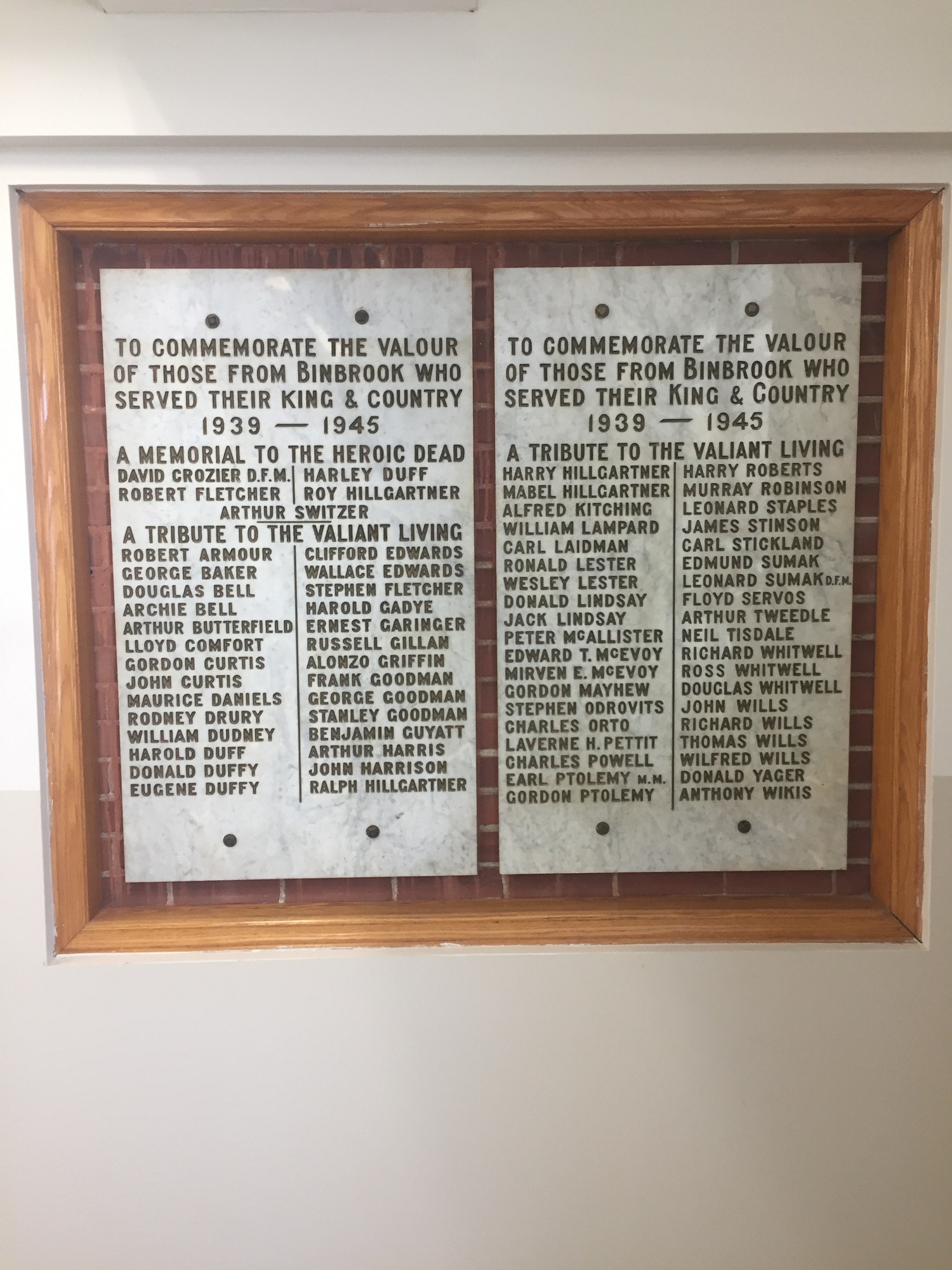 The Binbrook Second World War Plaques were installed in the Soldiers’ Memorial Hall in 1946.