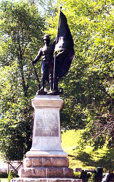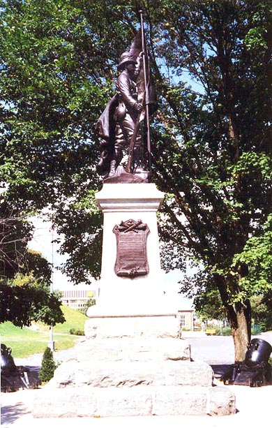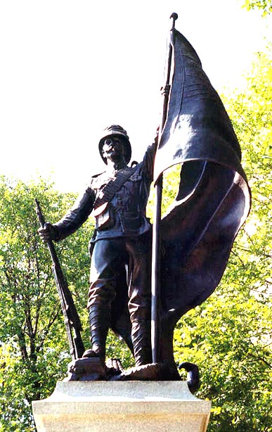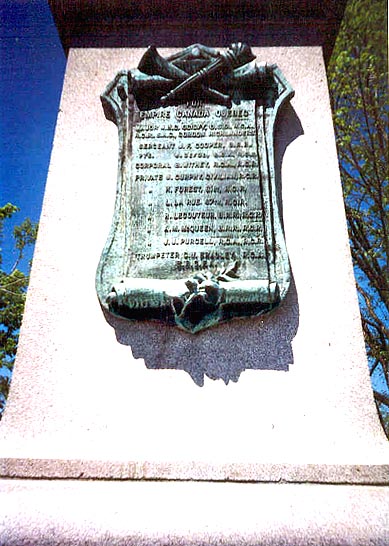 The Boer War Memorial was unveiled on 15 August 1905 in the presence of Lord Grey, Governor-General of Canada, the Prince of Battenberg and officers of six British naval warships. It was dedicated to all Quebecois who were killed in action during the Boer War. This memorial was erected on the site of departure of the first Canadian contingent for South Africa, on 30 October 1899. Sculpted by Hamilton Plantagenet MacCarthy, the statue soldier wears the colonial uniform, holding a rifle in one hand and the Canadian Red Ensign in the other. The brief verses on the right side of the monument are from the pen of Reverend M.F.G. Scott, of Quebec.