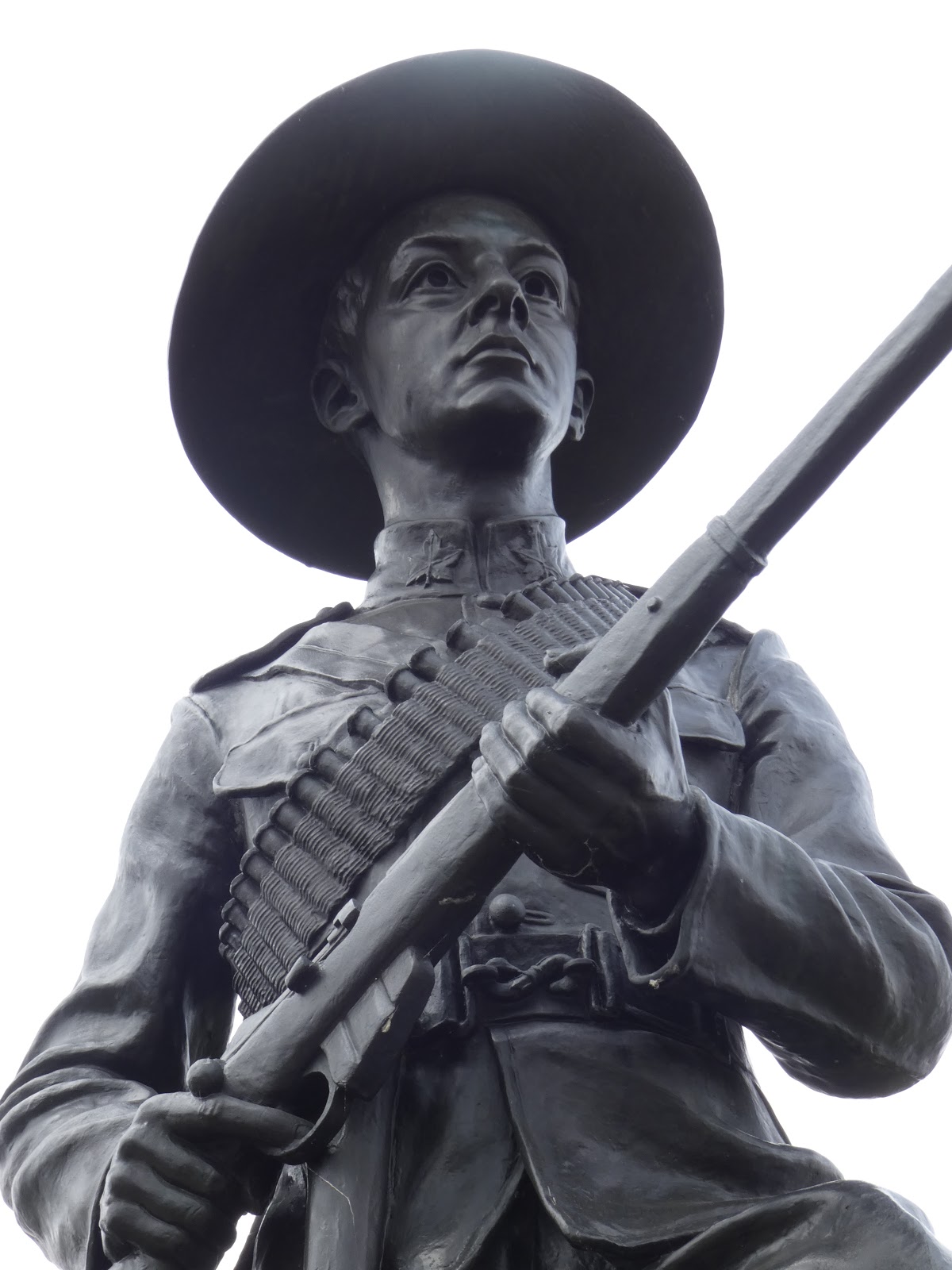 There were thirty men who volunteered to fight with the British and Canadian units in South Africa in 1899. The monument, designed by Hamilton MacArthy of Ottawa, depicts a soldier ready for battle mounted on a granite base. On the four sides of the base are bronze plaques, one depicts the three Brantford heroes who lost their lives and three illustrate the respective battles in which they fell. The attack on the Boer position at the Battle of Spion Kop where Lieutenant Osborne fell; the Battle of Hart's River where Corporal Sherritt lost his life; the defense of the British guns at the Battle of Belfast where Lieutenant Builder suffered fatal injuries. A Howitzer is located behind the memorial.