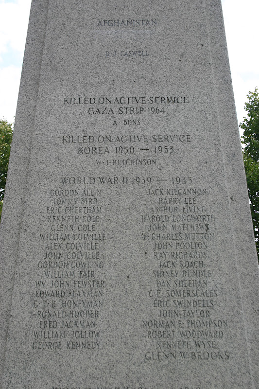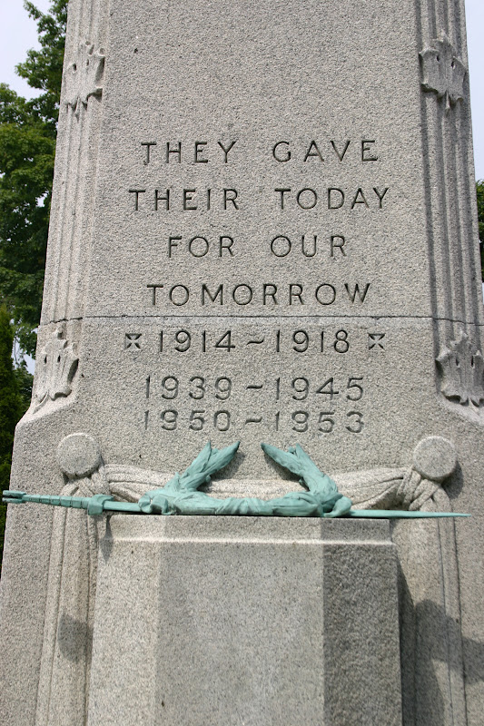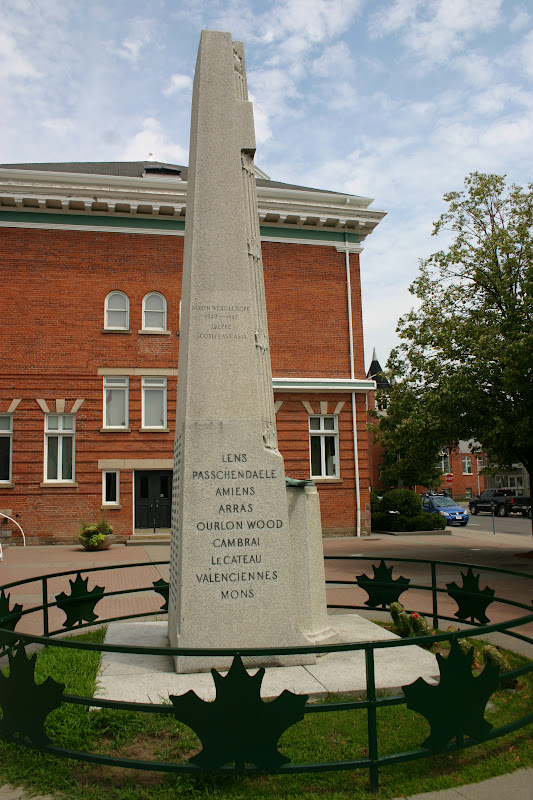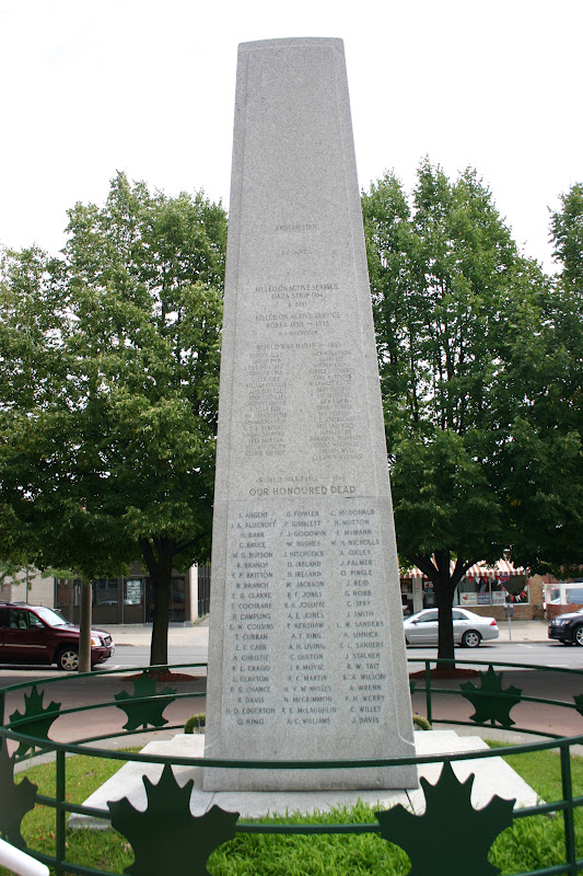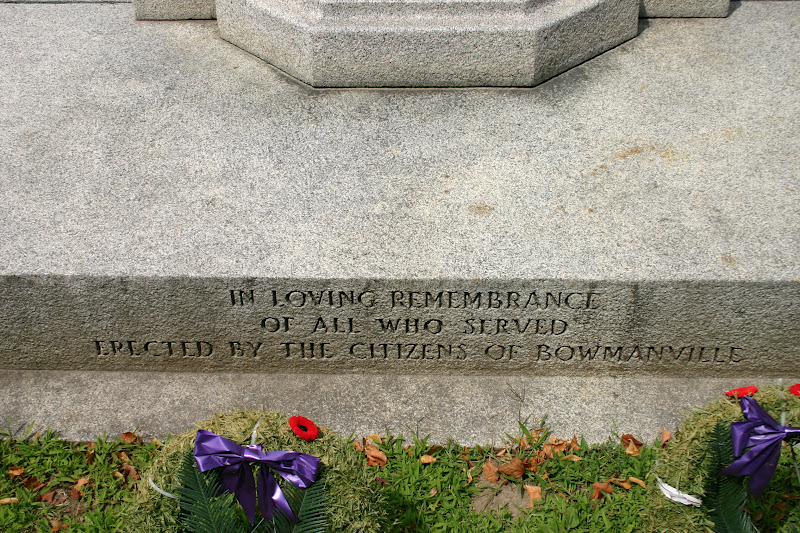 The Bowmanville Veterans' Memorial Monument was constructed in 1922 and erected by the citizens of Bowmanville. The monument was constructed in memory of veterans who gave their lives in the First and Second World Wars, the Korean War, and the war at Gaza Strip.