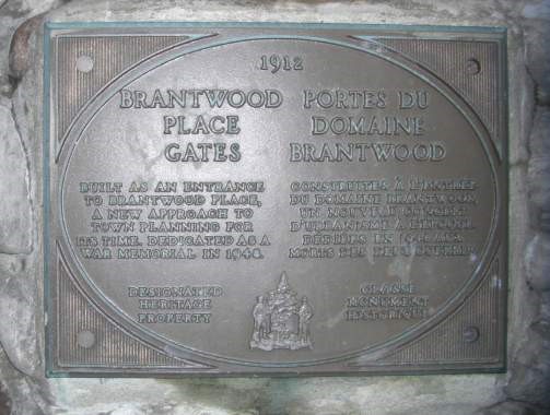 The Brantwood Place Stone Gates, built about 1912, were made of local field stone set in a concrete and capped by stone balls. Originally built by Robert Sibbitt, the focal point ultimately became a war memorial. Led by long-time residents E. P. Nunn, Art Humphries and many others, in 1948 residents negotiated with the city to designate the gates as a war memorial. The dedication took place on Remembrance Day of that year.