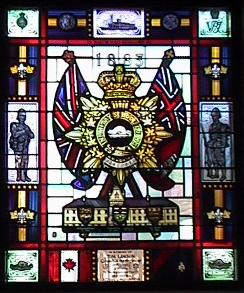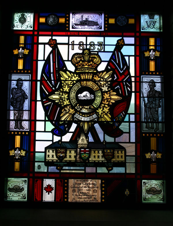 Royal Canadian Regiment (RCR) memorial dedicated to Brig Lawson killed in Hong Kong in 1941 (December) - An RCR Officer. This window was designed and installed in 1991. The entrance has a gold brick wall in memory of RCR deceased.