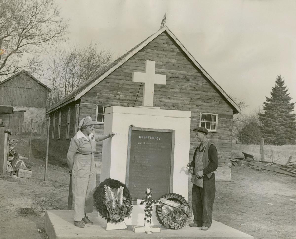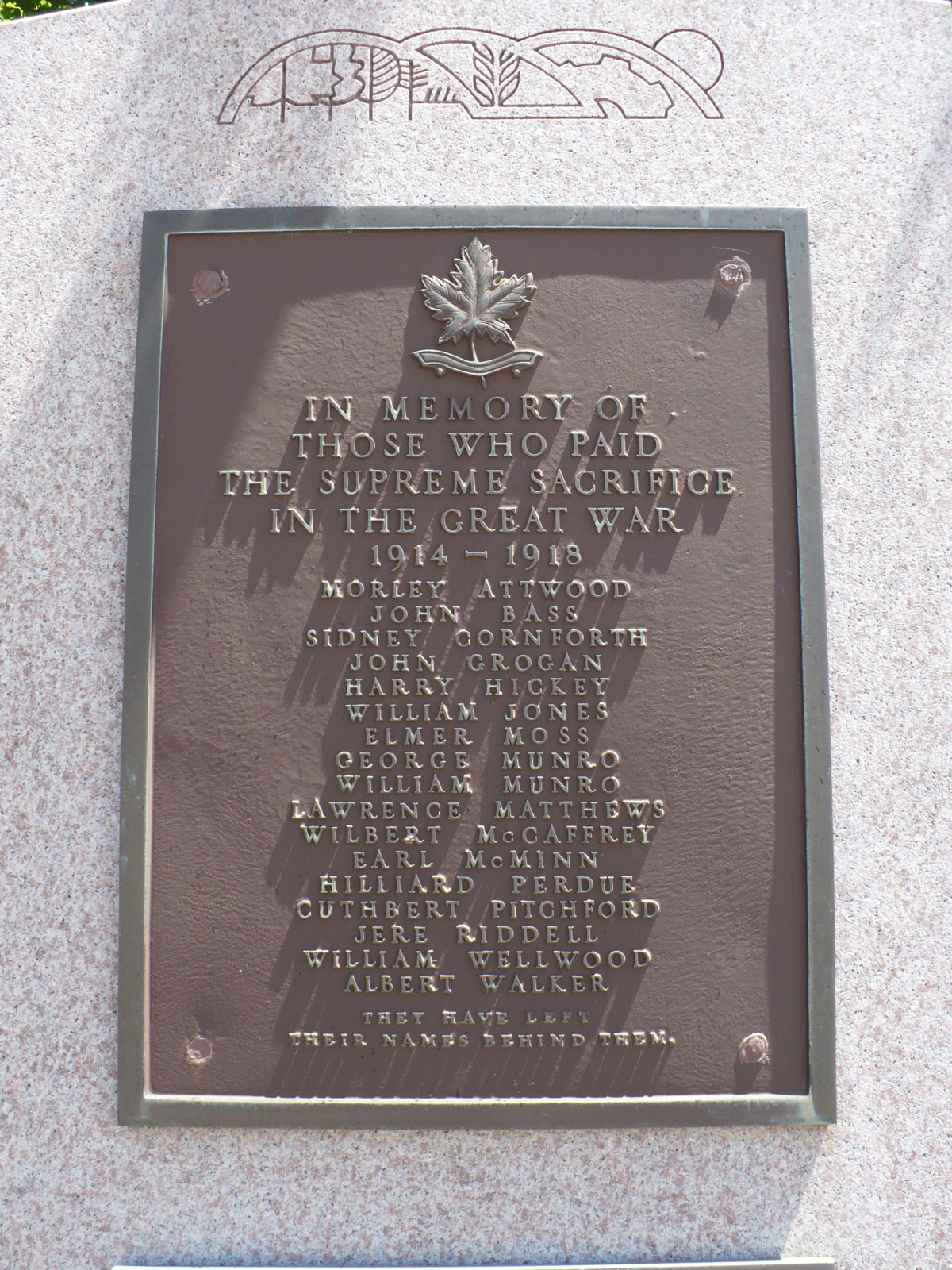 On November 11, 1944, members of the local Canadian Legion and citizens of the village and surrounding communities gathered at the Legion Hall to pay tribute to those who had made the supreme sacrifice in the previous Great War and a beautiful cenotaph, erected by the members of the local Legion, was unveiled in their honour. The cenotaph was designed by First World War Veteran Norman Hutchinson.