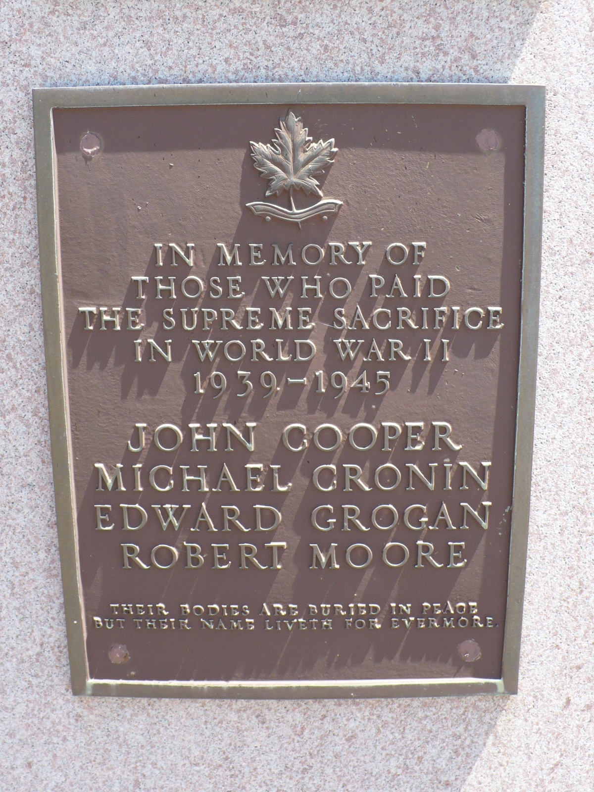 On either side of the path leading to the front entrance of the building were two cenotaphs, one for each of the two World Wars. They were made of concrete, approximately two feet wide by three to four feet high, with a cross on top. The names of the men were printed on a plaque made of felt that was put onto a wooden back and encased in glass in the centre of the cenotaph. When this deteriorated, another was made of metal and the names were engraved on it.