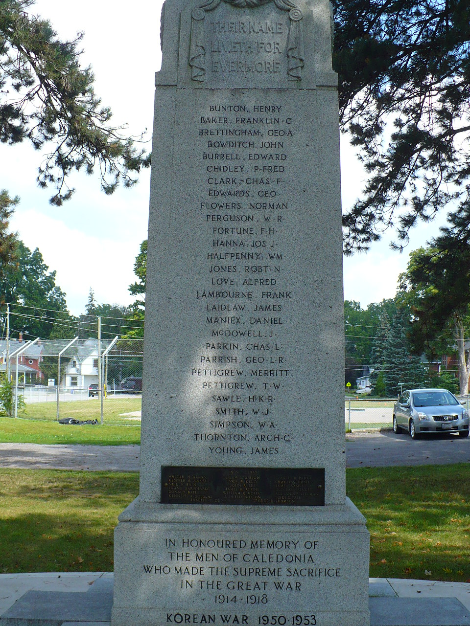 This memorial was erected in honour of the 28 men from Caledonia who died in the Great War. A bronze plaque was later added listing the 20 men whose lives were lost in the Second World War. The Korean War was also acknowledged.