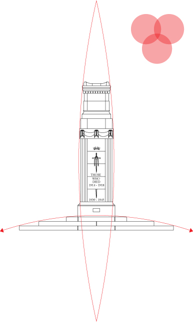 Many of the cenotaphs built in commonwealth countries resemble "The Cenotaph" in Whitehall, London. Designed by Sir Edwin Lutyens, it was as a memorial specifically for those who died in World War I. The Calgary Cenotaph and accompanying benches, were added in 1928, at the west end of the Memorial park. The Calgary Cenotaph (1928) recalls the original ideas of the original "The Cenotaph" in Whitehall, London, but differs slightly. Dedicated to the soldiers who died in both World Wars. As it was built prior to World War II, the front and back were amended with "and 1939 - 1945", and a longer sword blade, to include those that died in the second world war. The wreaths are draped around the Cenotaph, instead of the circular wreaths which were hung on the front and back of the original. The main difference though is the addition of the crown and sword which may be in reference to the Alberta troops also known as "Lord Strathcona's Horse (Royal Canadians)". The shape of a cenotaph is based on three circles or arcs. The base is only partially above ground, and (symbolically) goes deep into the earth. While the sides of the column create two arcs that meet up high in the sky.