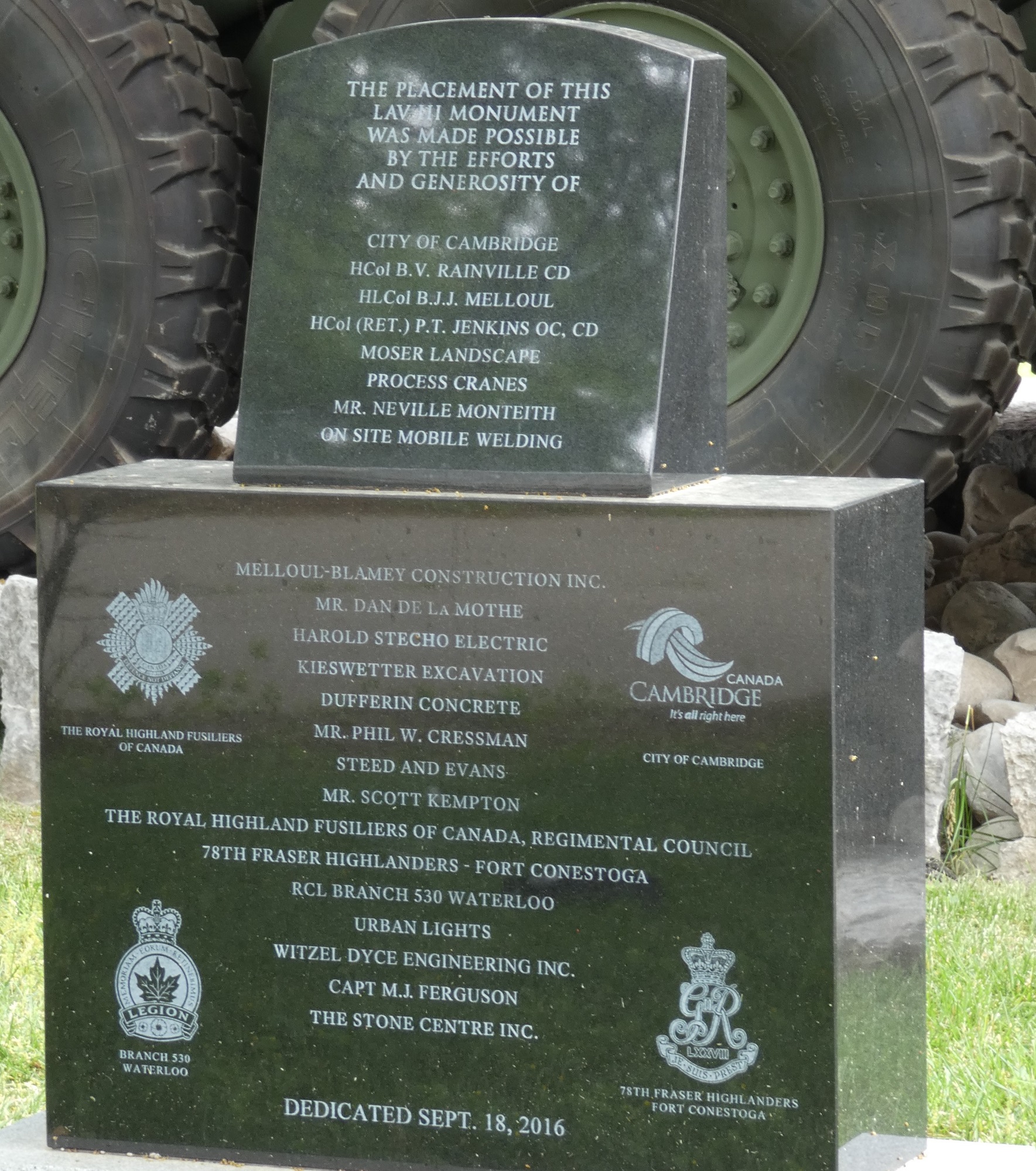 On Sunday Sept 18, 2016, the City of Cambridge, in partnership with The Royal Highland Fusiliers of Canada Regimental Trust, dedicated a LAV III Monument to commemorate the Afghanistan service of those from the City of Cambridge and the Region of Waterloo.