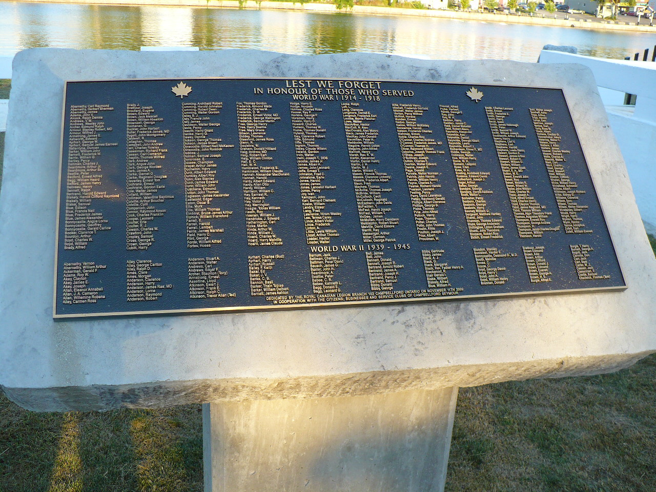 The Campbellford Cenotaph was erected in 1926, by two local chapters of the Imperial Orders of the Daughters of the Empire, at a cost of $5,000 to honour those lost in the Great War. It was restored and rededicated in 2009 when the missing names of 12 veterans who died in the First World War and one veteran who died in the Second World War were added.