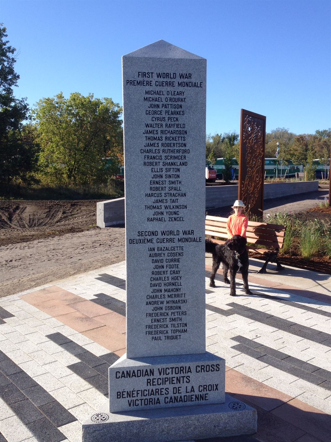 The Canadian Victoria Cross Recipients Monument is a four sided obelisk that stands 72 inches high and is about 20 inches wide. The four sides alphabetically list the Victoria Cross Recipients from the Crimean War, India’s First War of Independence, Bravery at Sea, Boer War, Second Boer War, First World War and Second World War.