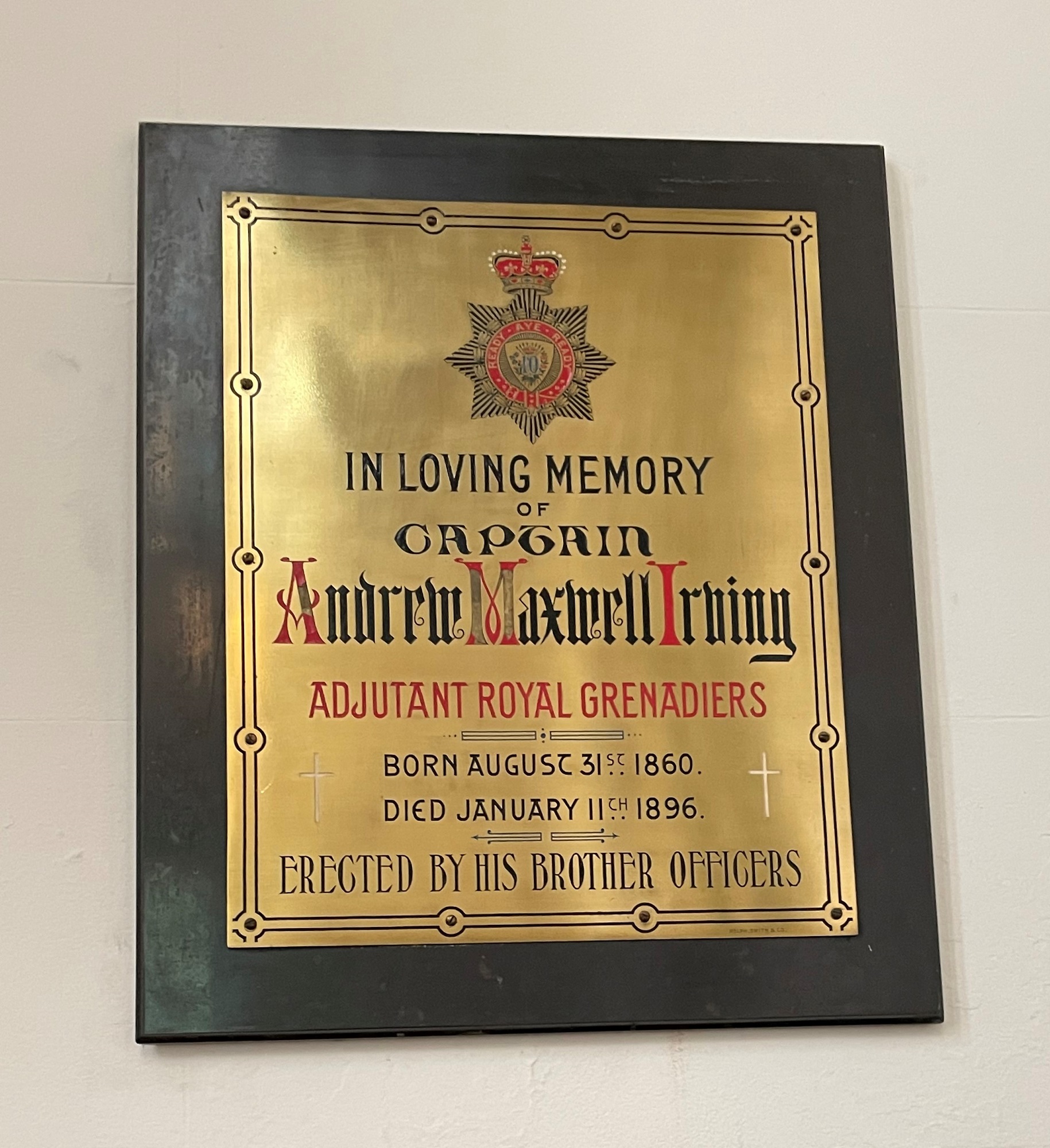 Captain Andrew Maxwell Irving served with the Adjutant Royal Grenadiers. This plaque was erected by his fellow officers and engraved by Rolph, Smith & Co.