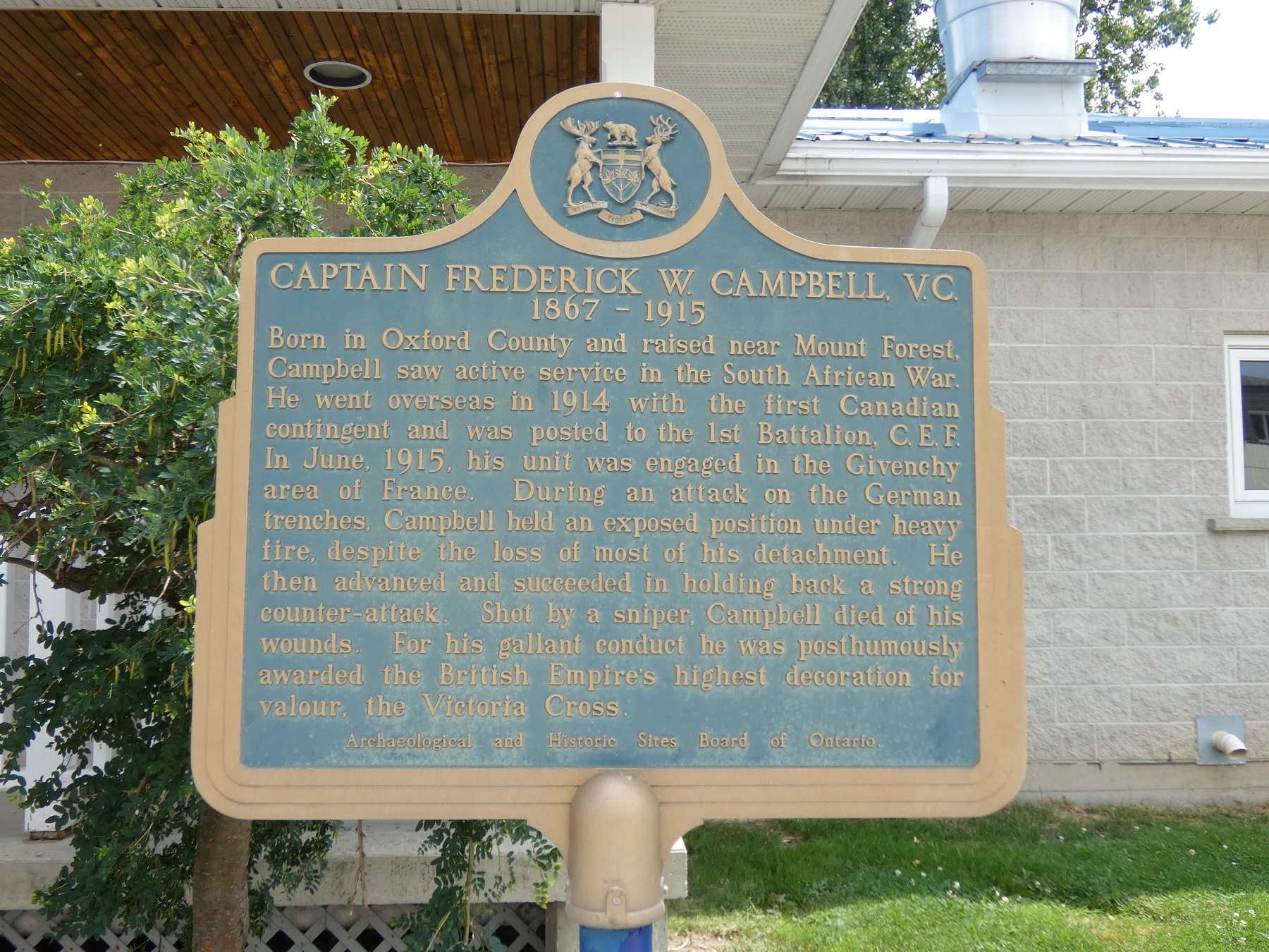 This memorial is dedicated to Frederick Campbell V.C. It was erected by the Archaeological and Historic Sites Board of Ontario in 1965.