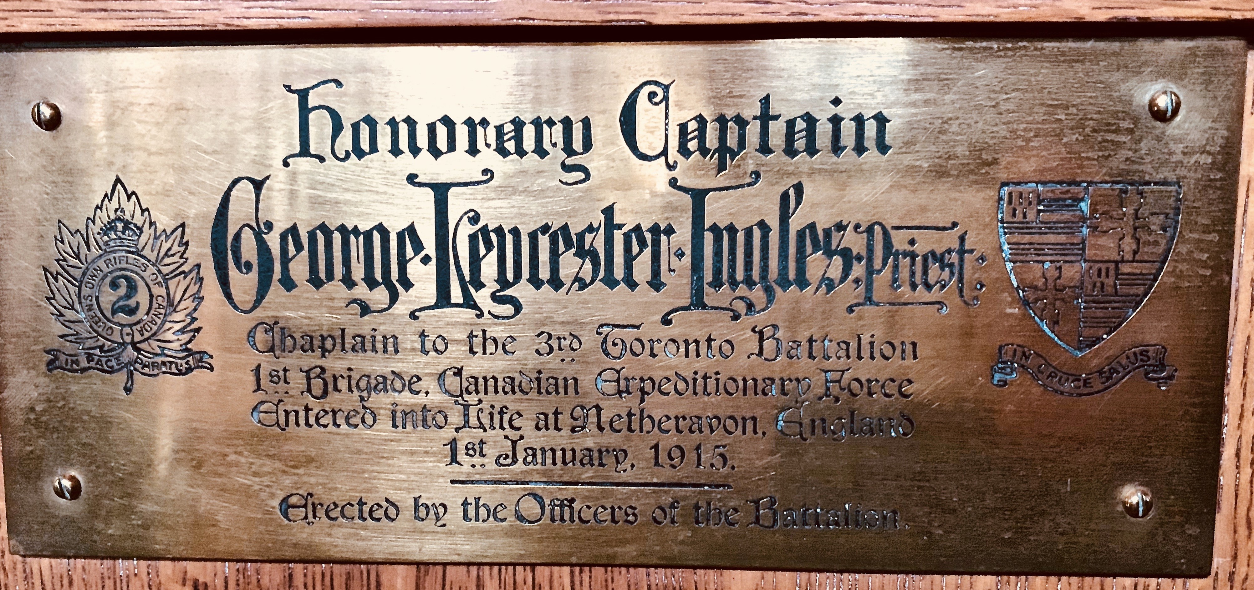 On 1 May 1917, a choir stall at St. Albans Cathedral was dedicated by the officers of the 3rd Battalion to honour Captain George Leycester Ingles who died in the First World War. The dedication was conducted by His Grace George Thorneloe, Archbishop of Algoma, who was assisted by the Bishop of Toronto.
