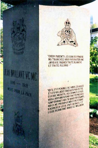 CAIX, FRANCE - LE 9 AOÛT 1918, À 13:00 HEURES, LA COMPAGNIE DE JEAN BRILLANT EST PRISES SOUS LE TIR DE L'ADVERSAIRE. APRÈS UNE ACTION RAPIDE, CELUI-CI PARVIENT À LE MAÎTRISER MAIS IL EST BLESSÉ À LA JAMBE. CEPENDANT IL REFUSE DE QUITTER DE COMBAT. À 15:00 HEURES, LA CONTRE-ATTAQUE REPREND AVEC PLUS DE VIOLENCE. IL ORGANISE DEUX PELOTONS, S'ÉLANCE DROIT SUR L'AGRESSEUR ET BRISE LA LIGNE DE FEU FAISANT DES PRISONNIERS. BLESSÉ À L'ÉPAULE GAUCHE, IL REFUSE DE QUITTER LE COMBAT. À 18:00 HEURES UNE PIÈCE D'ARTILLERIE DE CAMPAGNE, CAMOUFLÉE DANS LE BOIS DE MAUCOURT, TIRE SUR SES HOMMES. SANS HÉSITER, IL FORME UN DÉTACHEMENT À LA TÊTE DUQUEL IL PART À L'ASSAUT DE L'ENNEMI INVISIBLE. APRÈS UNE AVANCE DE 2000 PIEDS IL EST BLESSÉ À L'ABDOMEN. IL REFUSE DE QUITTER LE COMBAT ET CONTINUE ENCORE 1000 PIEDS SANS SE SOUCIER DE LA BLESSURE MORTELLE. IL TOMBE ALORS INCONSCIENT. MAIS SA BRAVOURE ENFLAMME SES HOMMES D'UNE ARDEUR QUI CONTRIBUE À LA VICTOIRE DE SON BATAILLON. AINSI MOURUT LE CAPITAINE JEAN BRILLANT V.C., M.C., À 28 ANS. IL REPOSE DANS LE PAYS DE SES ANCÊTRES, À CÔTÉ DE CEUX QUI, COMME LUI, SONT MORTS POUR LE TRIOMPHE DE LA JUSTICE ET DE L'HUMANITÉ.