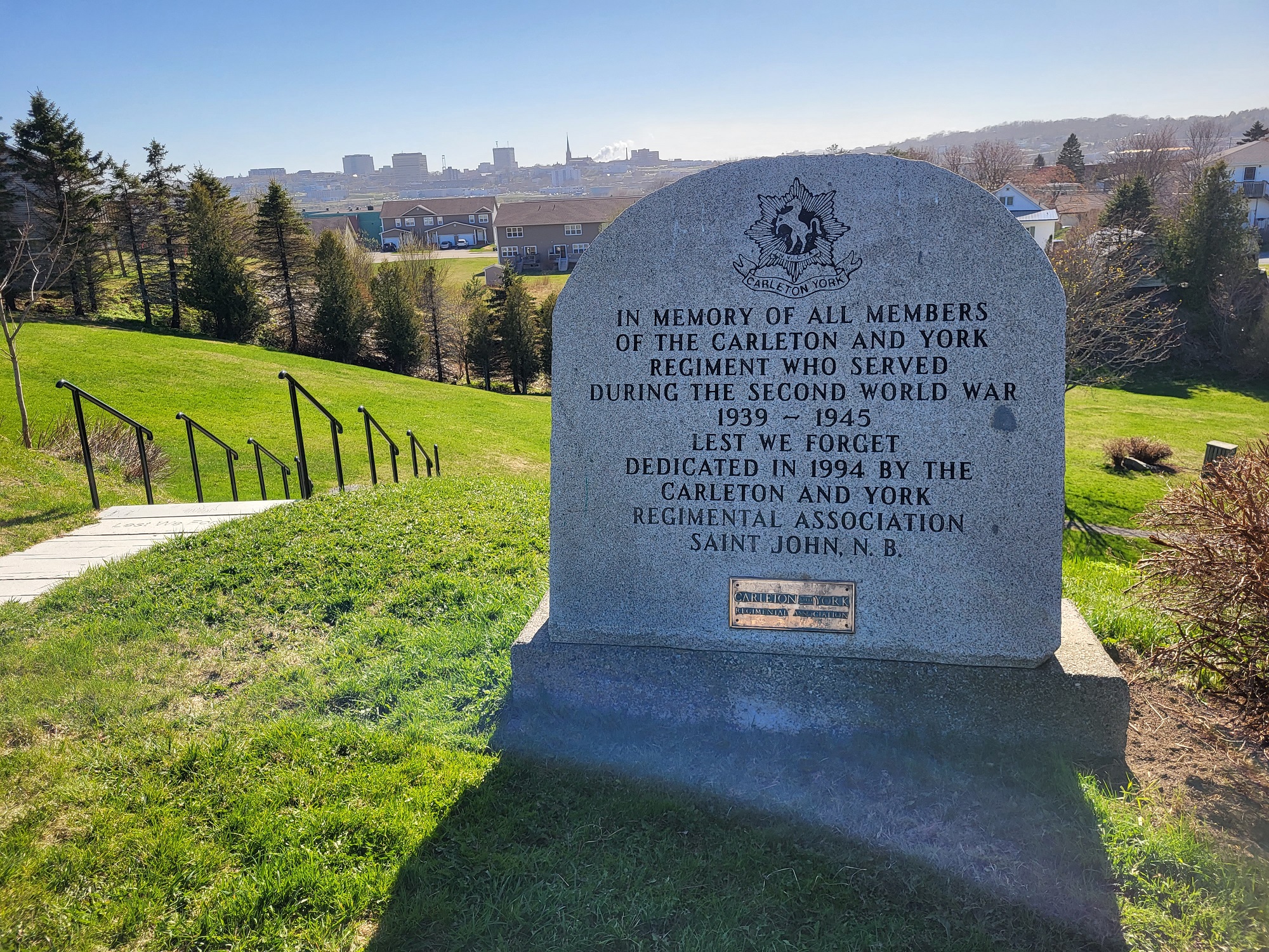 This memorial is dedicated to all the members of the Carleton and York Regiment who served in the Second World War. It was erected in 1994 by the Carleton and York Regimental Association. Carleton and York Regiment Story The Regiment mobilized on September 1, 1939. It embarked for the United Kingdom on December 9, 1939. On July 10, 1943, it landed in Italy as part of the 1st Canadian Infantry Division. The Regiment was moved to North-West Europe in March of 1945. The "2nd Canadian Infantry Battalion (Carleton and York Regiment)" mobilized on June 1, 1945, for service with the Canadian Army Pacific Force, but Japan surrendered before the force could be sent into action. Battle Honours: Landing in Sicily, Landing at Reggio, Point 59, Hitler Line, Naviglio Canal, Italy 1943-1945, North-West Europe 1945.