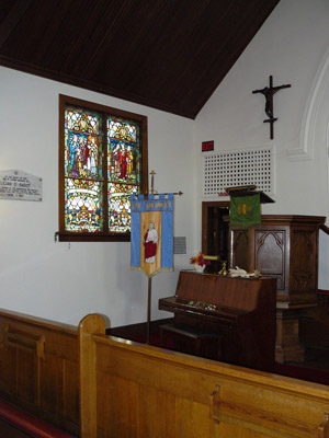 The two window panels represent the last stage in the story of Jesus's life. Depicted on the left panel: The Women Come to the Tomb, when they found it empty. The window's bottom panel has the Coat of Arms of the Winnipeg Grenadiers, Private Johnson’s regiment. Depicted on the right panel: The Emmaus Road, one of the early resurrection appearances of Jesus after the crucifixion. The window's bottom panel has the Shield from the Coat of Arms of Canada, with green maple leaves, which were changed to red in 1957. The two window panels were the first to be installed after the Memorial Altar Window.