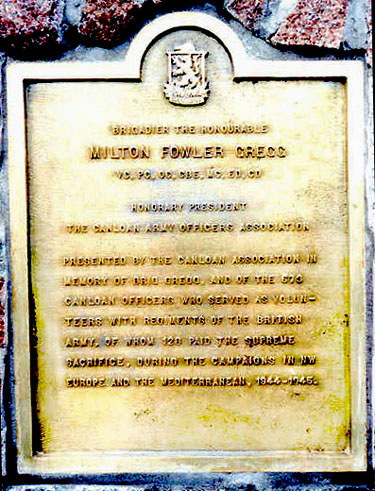 PRESENTED BY THE CANLOAN ASSOCIATION IN MEMORY OF BRIG GREGG, AND OF THE 673 CANLOAN OFFICERS WHO SERVED AS VOLUNTEERS WITH REGIMENTS OF THE BRITISH ARMY, OF WHOM 128 PAID THE SUPREME SACRIFICE, DURING THE CAMPAIGNS IN NW EUROPE AND THE MEDITERRANEAN, 1944-1945.