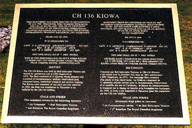 Dedicated on 13 June 1996, this memorial, a CH-136 Kiowa helicopter, stands in memory to all of the personnel who worked on this type of helicopter and the CH-135 Twin Hueys with 403 and 422 Squadrons at CFB Gagetown. In particular, the memory is dedicated to the memory of three military personnel killed in a Kiowa crash near Corner Brook, Newfoundland, on 17 February 1977. The memorial was erected by Air Command, Bell Helicopter Textron and the 2nd Battalion, The Royal Canadian Regiment.