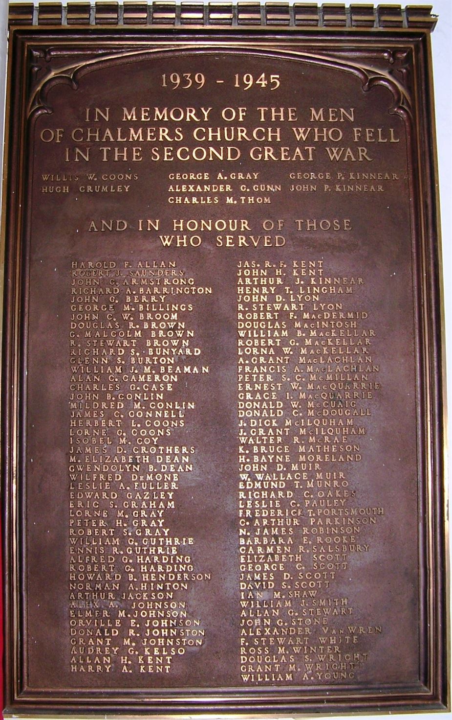 The Chalmers Church Second World War Plaque honours the men who fell and those who served during the Second World War.