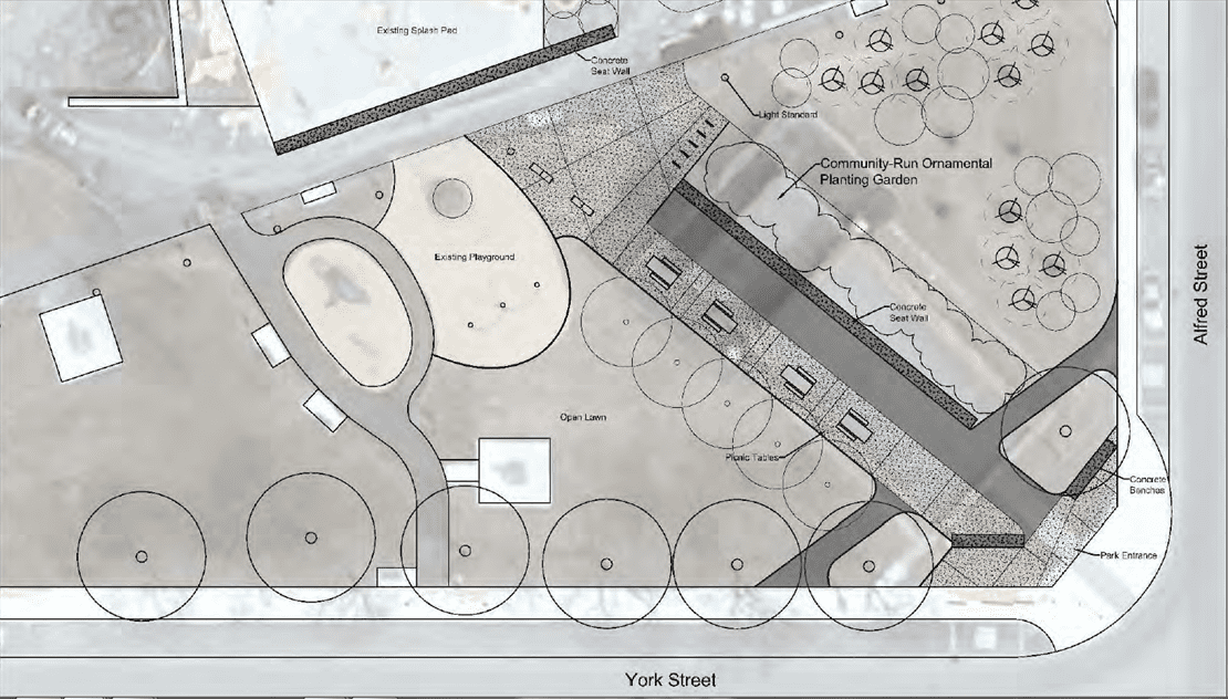 Memorial Centre Linear Park, whose name was developed from the style of the circular pathway that surrounds the perimeter of the park, is meant to provide a circular motion throughout the space, and features new benches, park lighting, and the addition of about 200 new trees. Also on the grounds is a completely fenced in dog park. It's a wide-open space that is very rare in the city and it's easily accessible. The baseball diamonds were upgraded, and new benches were added that allow the user to sit and enjoy the space.