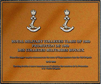 This memorial was erected by Alumni of the class of 1960 at the Royal Military College of Canada. The bronze plaque was presented to the Commandant of the Royal Military College of Canada in September 2006. The memorial is dedicated to the class of 1960, it commemorates the entry of class members into the Old Brigade 66IX 2006. The five sugar maple trees were planted on May 10, 2006, along the Duty Drive.