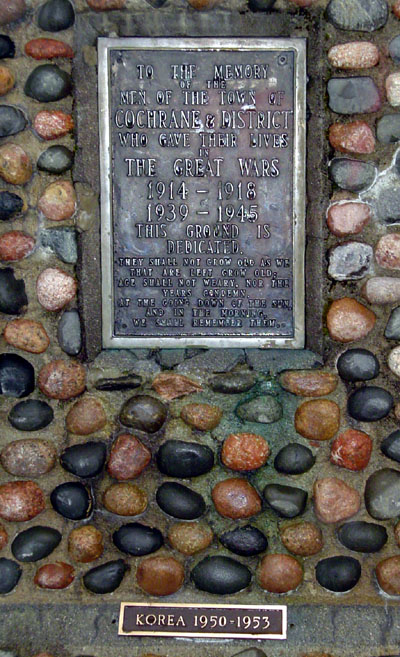 This memorial was dedicated to all those who fought in the First and Second World Wars and the Korean War. It was erected by the Royal Canadian Legion, Branch 89 and the Corporation of the Town of Cochrane.